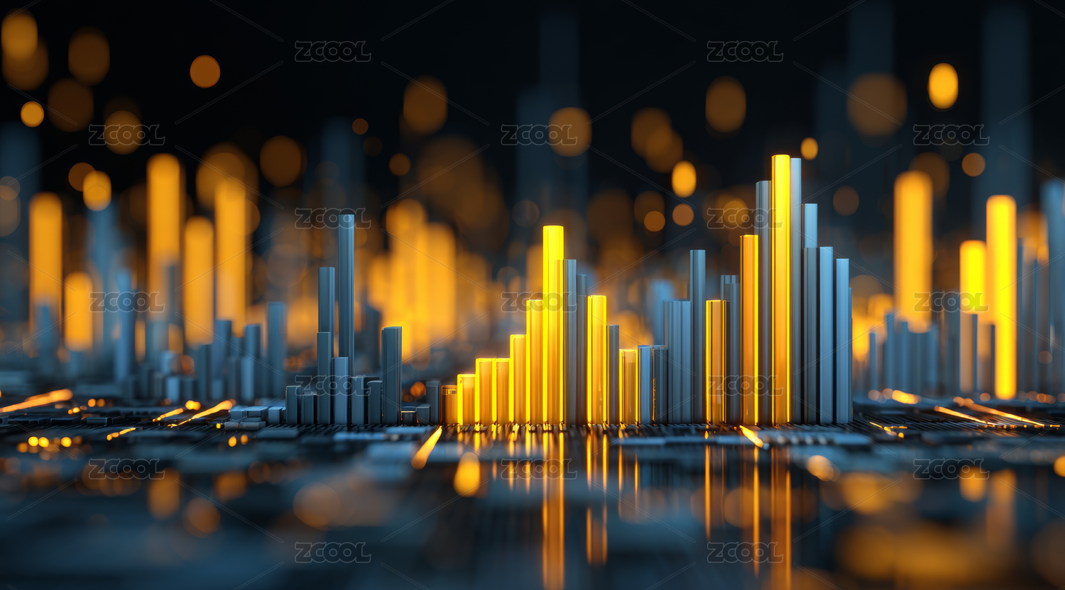 金色柱状图模糊城市背景商务金融三维图