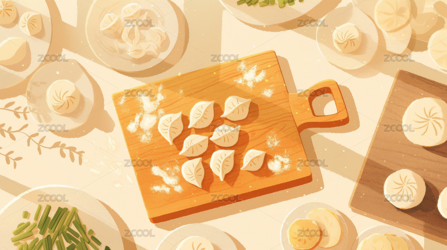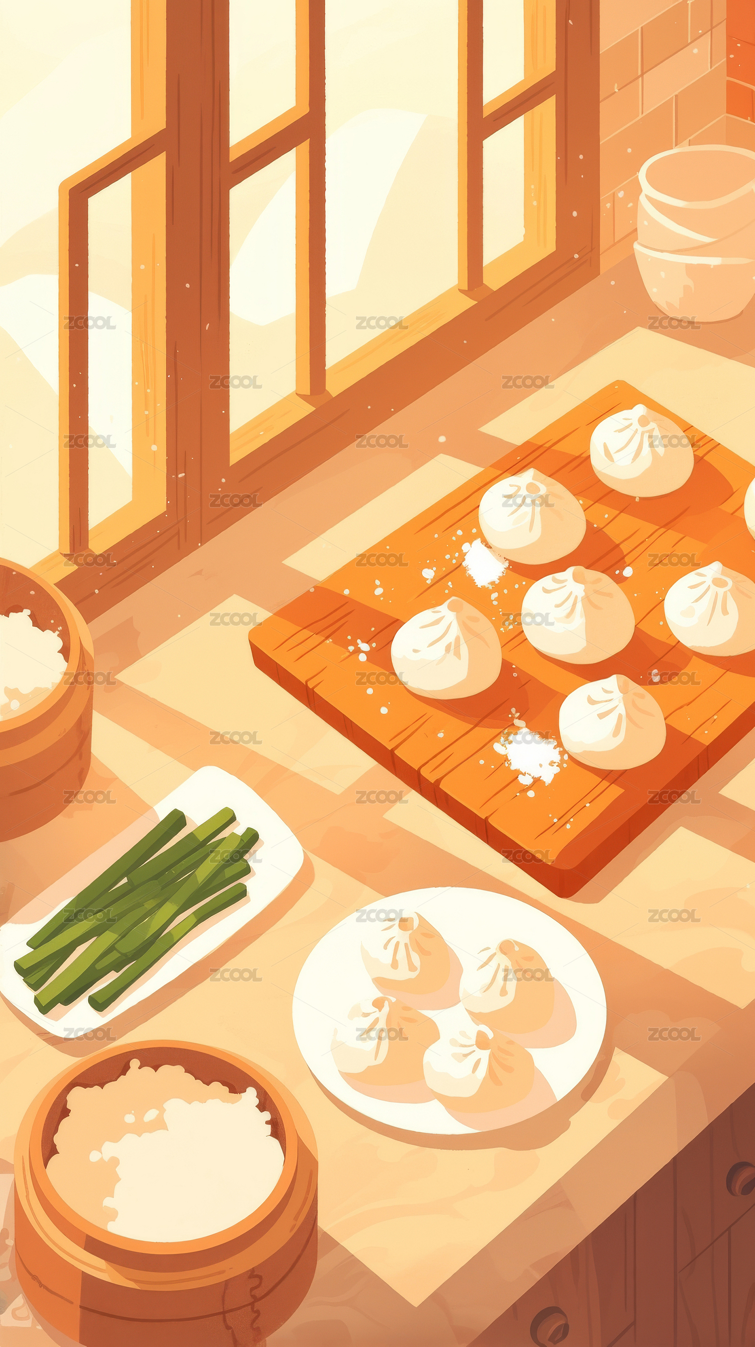 卡通冬至饺子蒸笼美食活动背景矢量插画