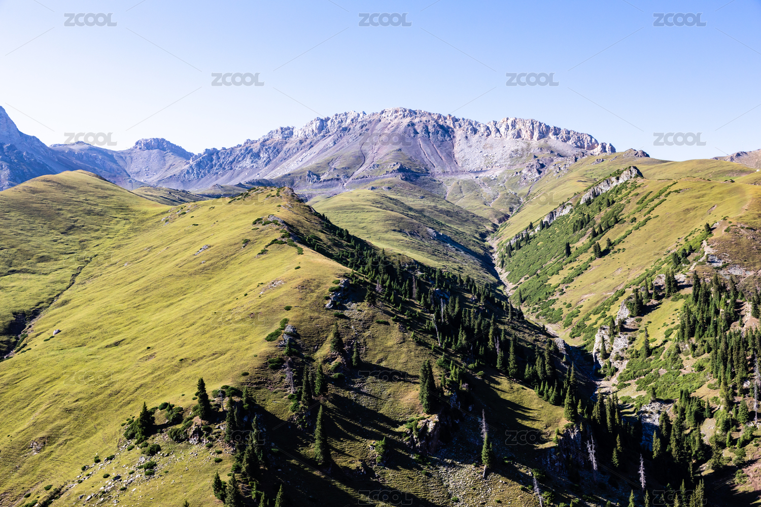 中国新疆伊犁伊昭公路绿色山坡鸟瞰图