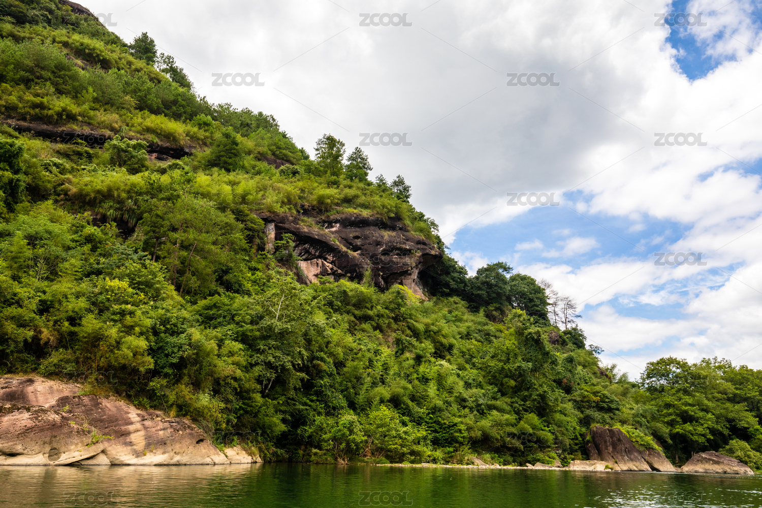 中国福建省武夷山,九曲溪畔巍峨伫立的丹霞山岩