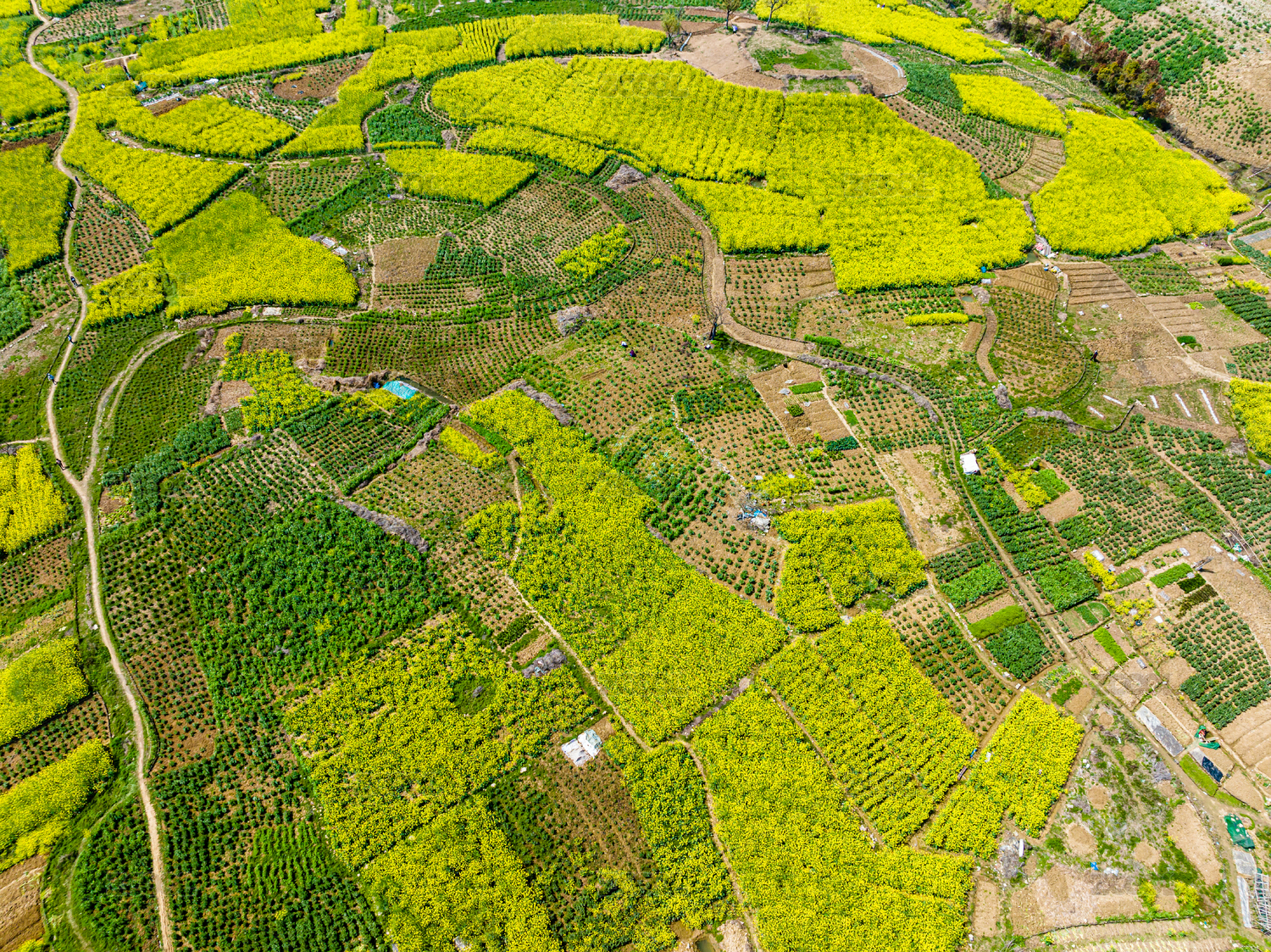 航拍春季陕西汉中洋县油菜花田村庄风光