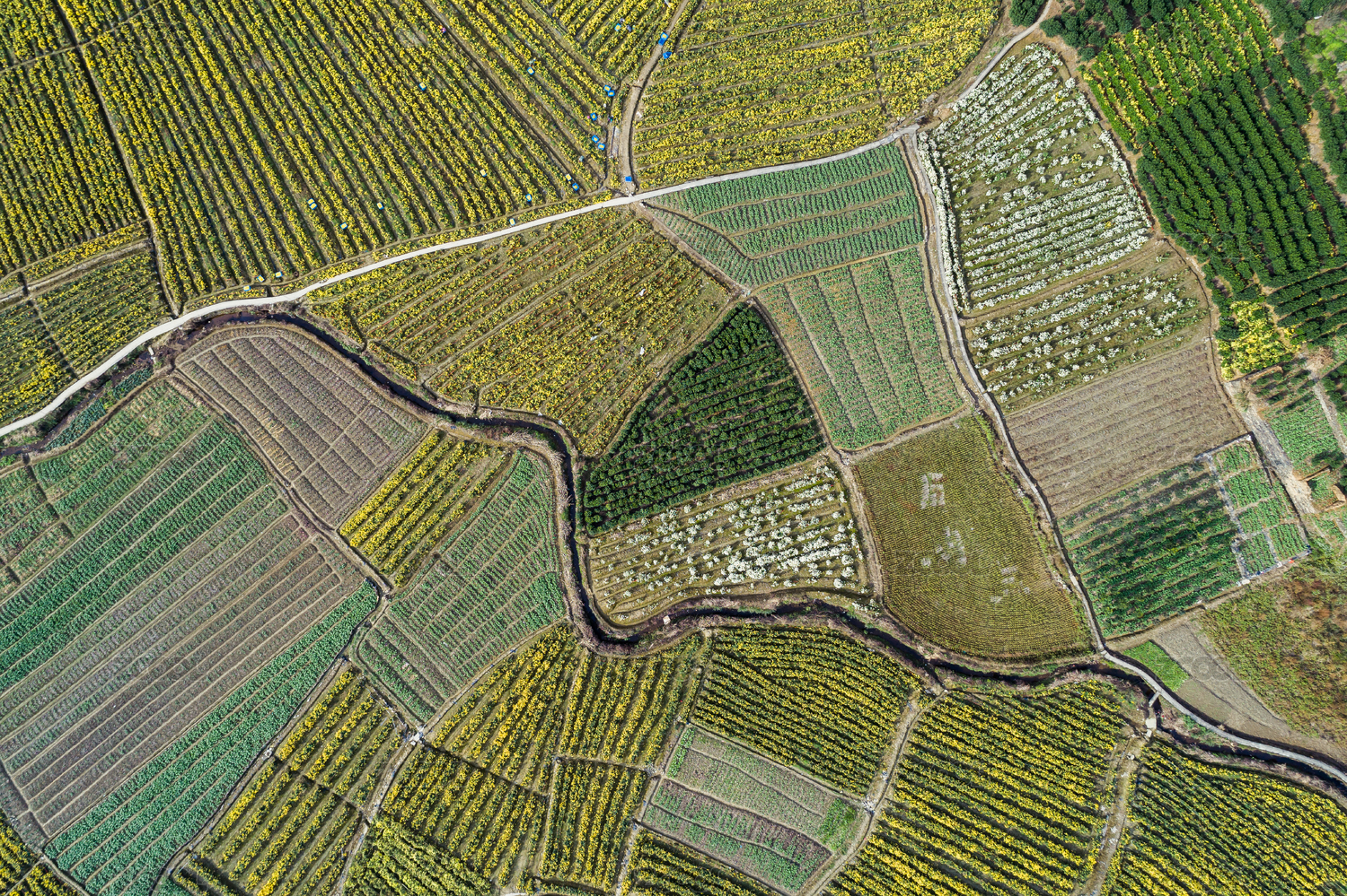 航拍浙江省杭州市富阳区东梓关村的油菜花地
