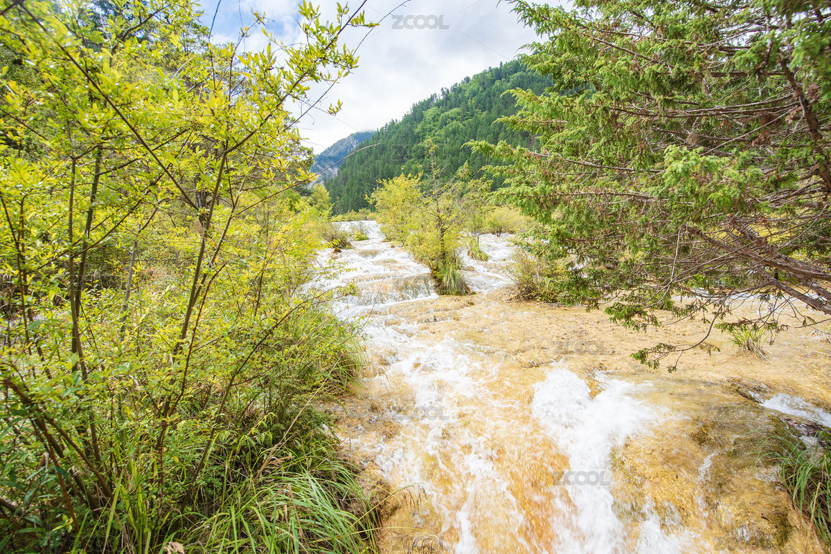 四川,九寨沟,瀑布,水流,白色,珍珠滩瀑布,树木,晴天,白云,钙华