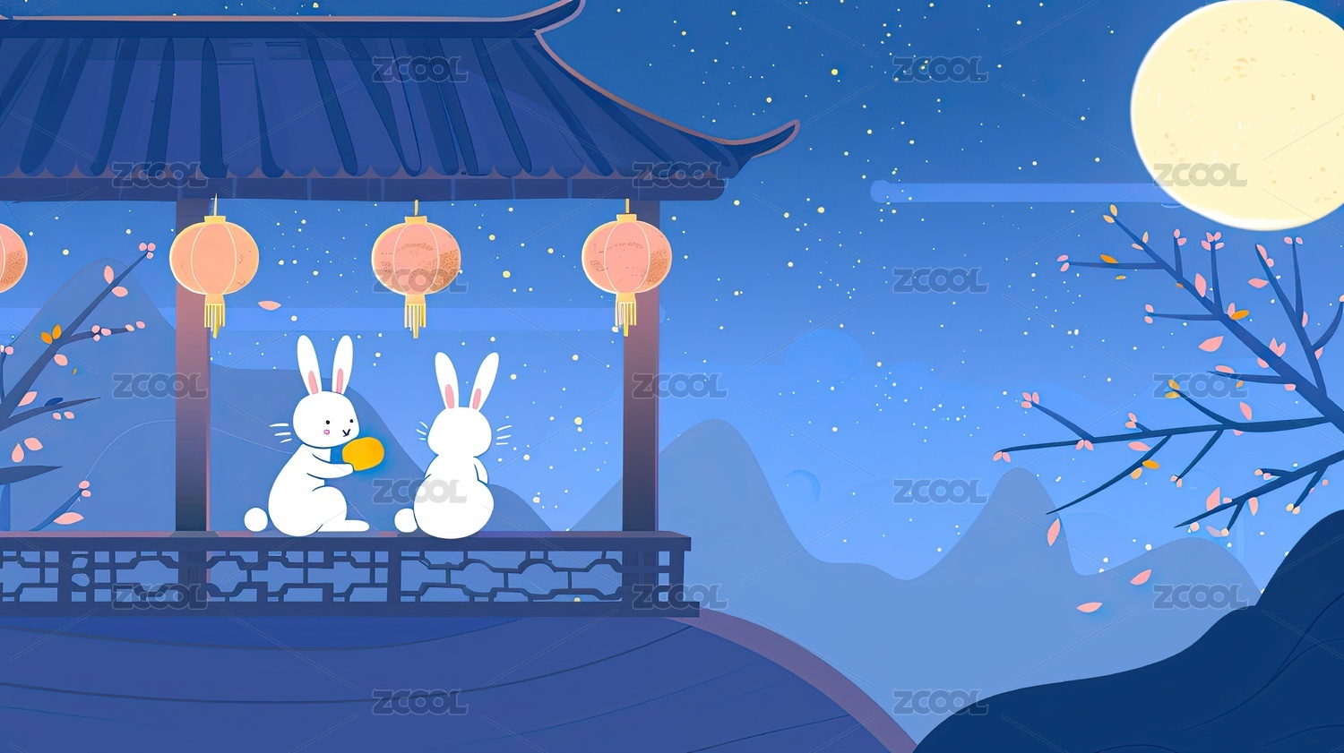 八月十五中秋节兔子屋顶赏月中国风国潮插画