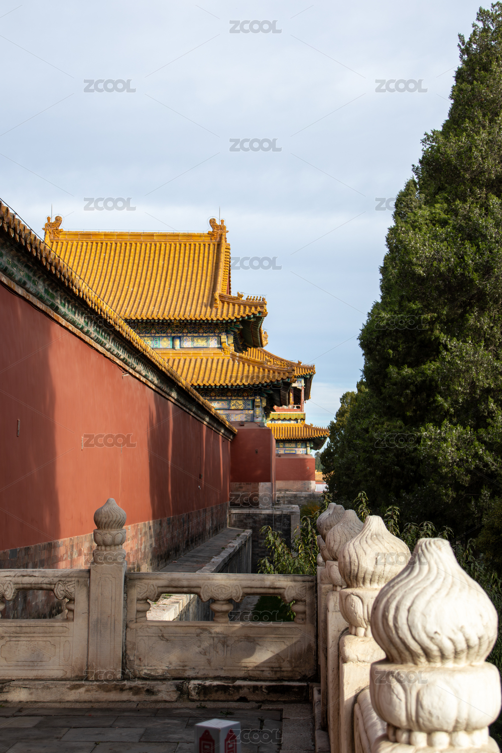 蓝天白云下红墙黄瓦的北京故宫西六宫建筑