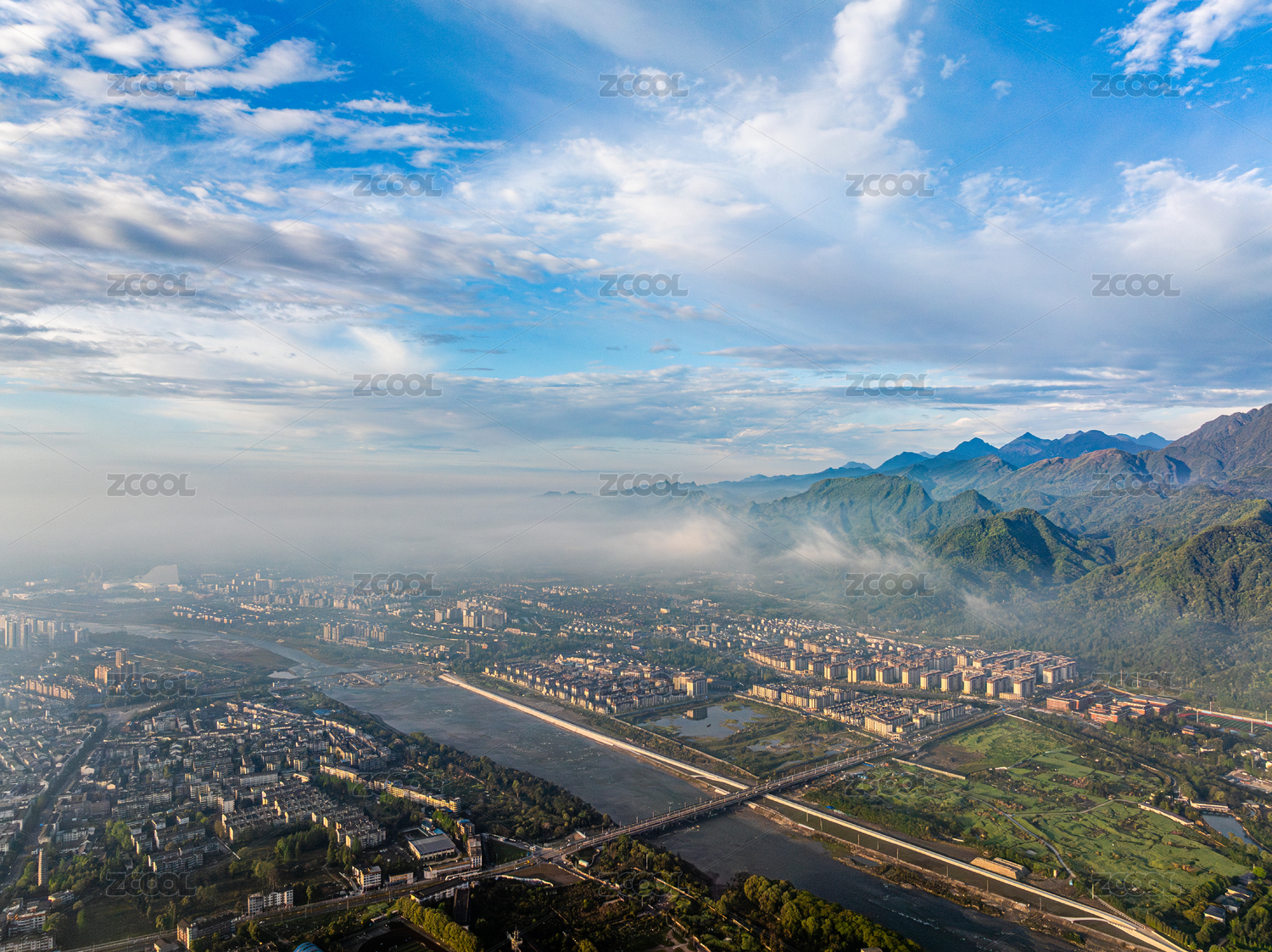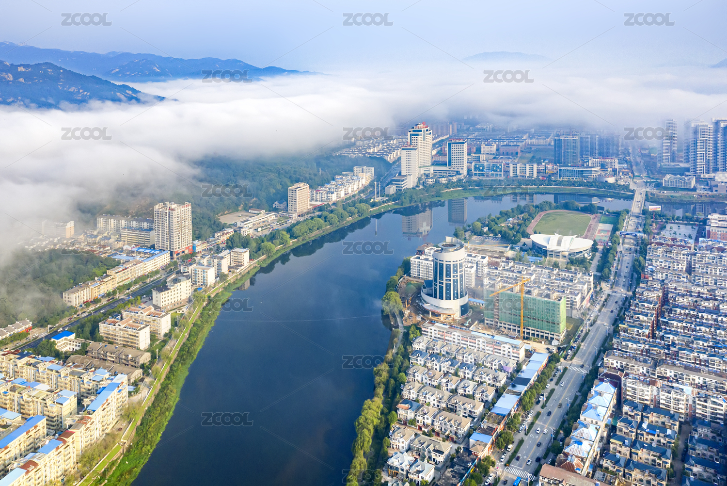 中国,河南,信阳市,新县,县城,航拍,云雾,晨雾,大别山,老区