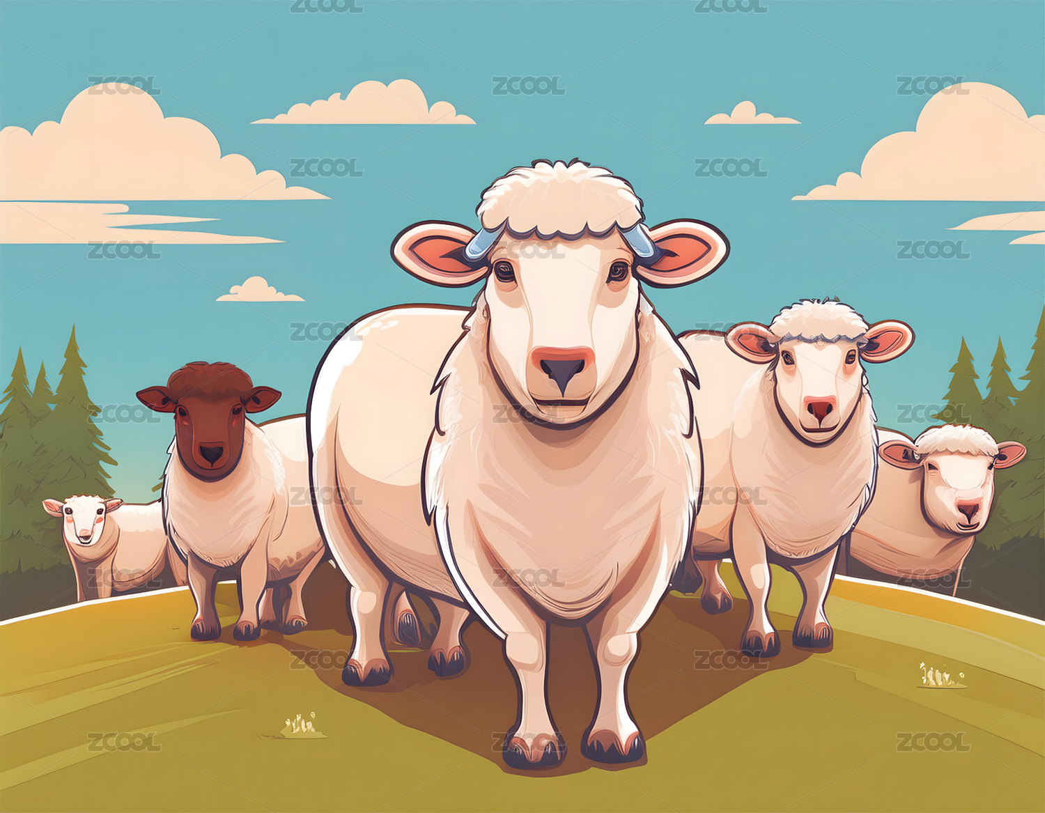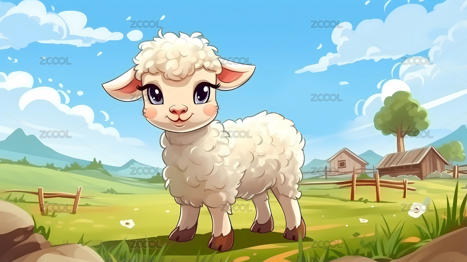 羊,绵羊,田野,草原,绿色,牧场,阳光,白云,风景,绘画