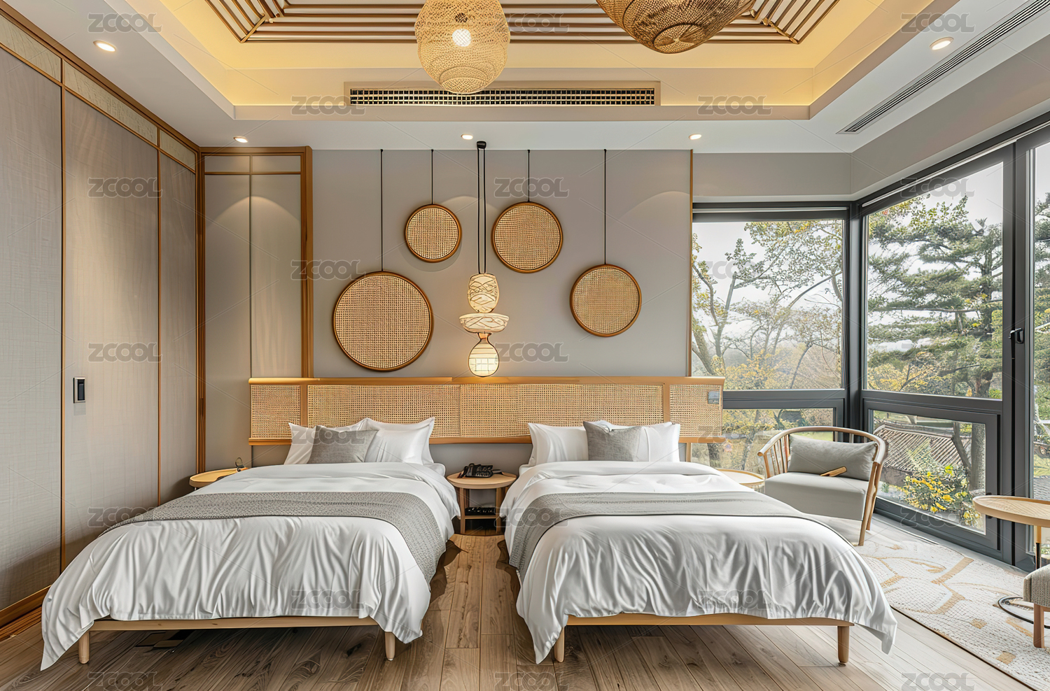 蓝色,灯光,纹理,自然光,舒适,宁静,床,卧室,阳台,落地窗