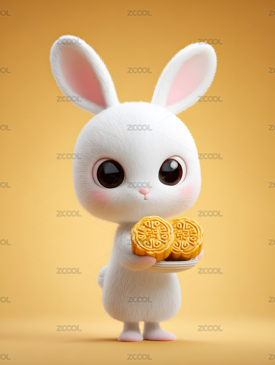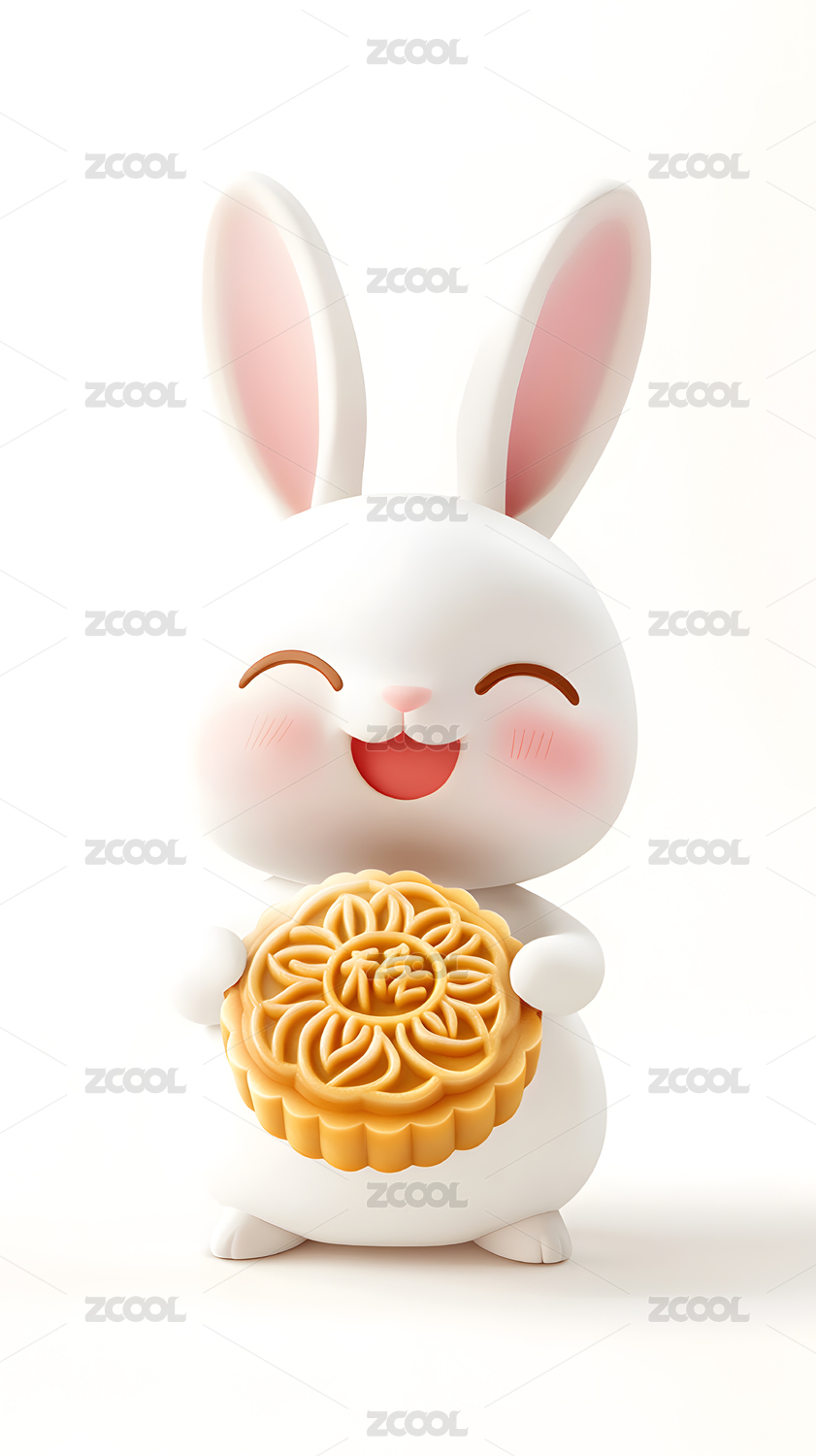 三只萌趣卡通白玉兔与中秋传统月饼3D插画