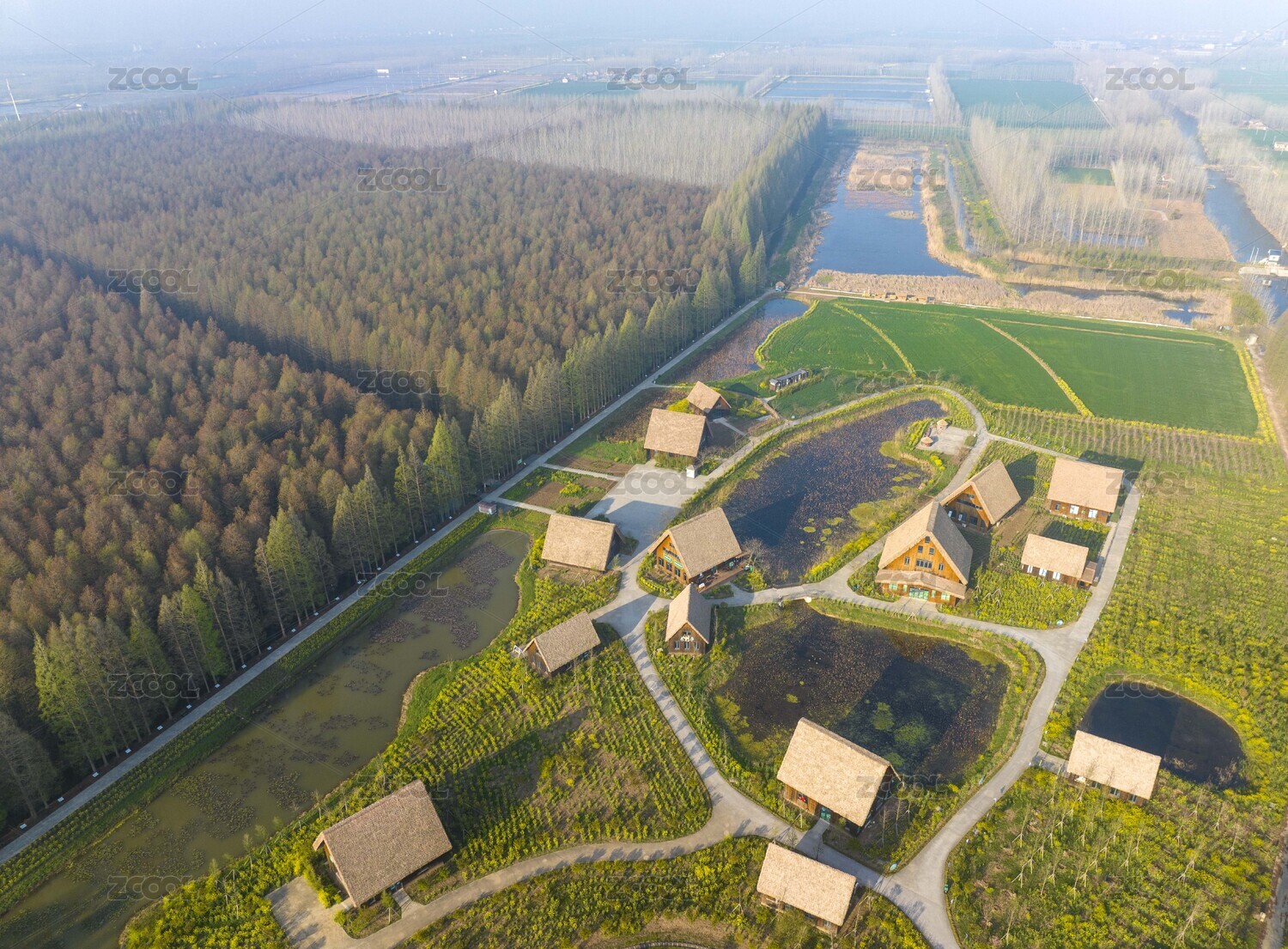 航拍武汉江夏安山湖湾樾舍度假区风景