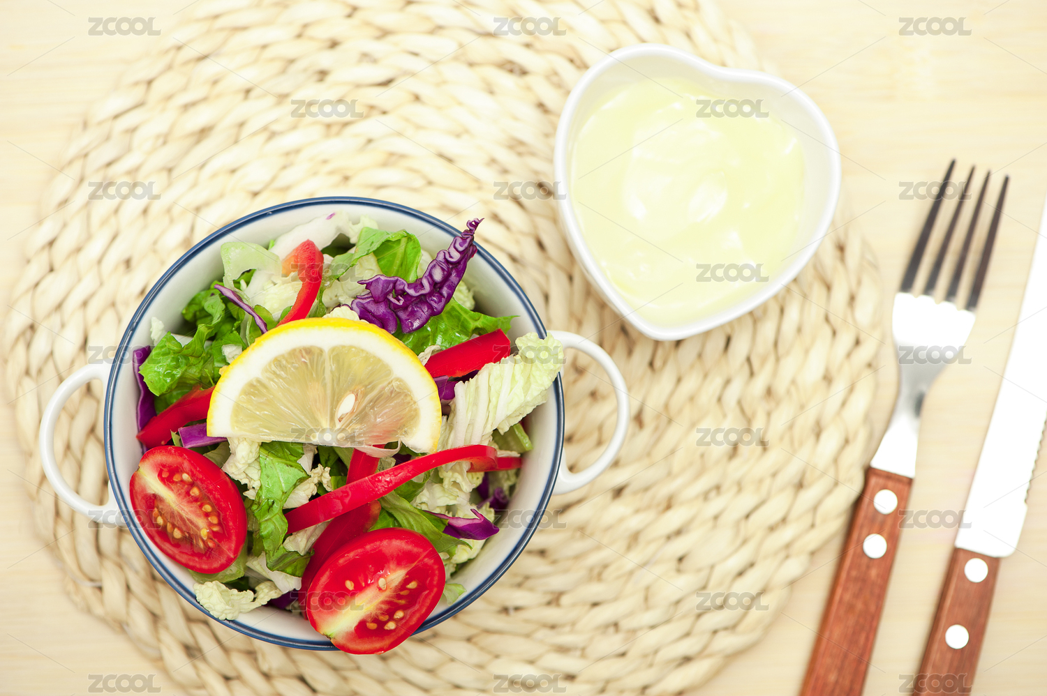 浅色餐布上玻璃碗里的蔬菜沙拉