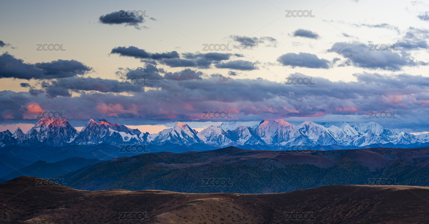 四川甘孜藏族自治州黑石城眺望贡嘎群山日落