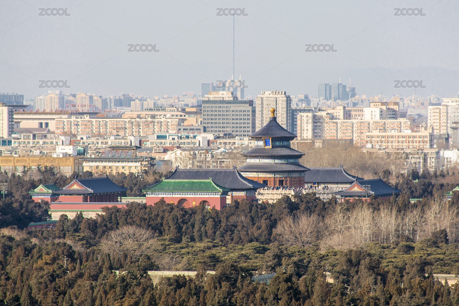 从景山公园最高点俯瞰冬日里的北京城市风光