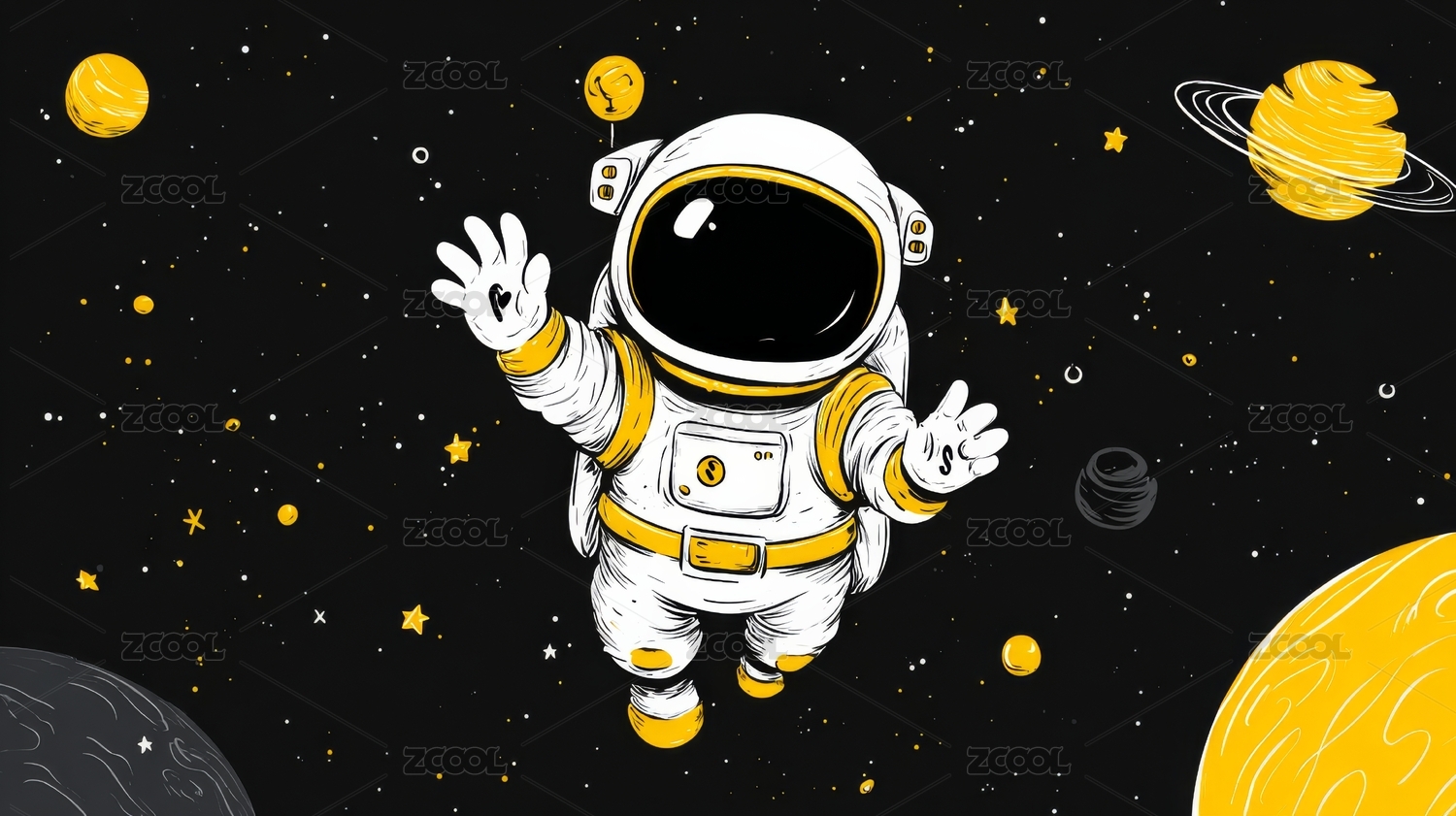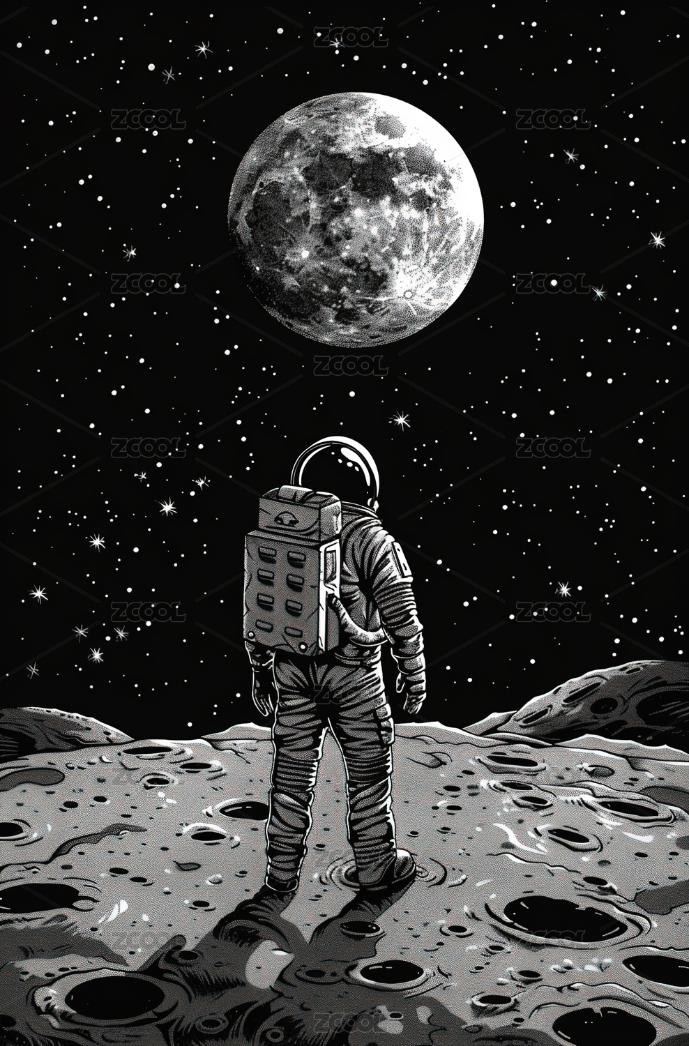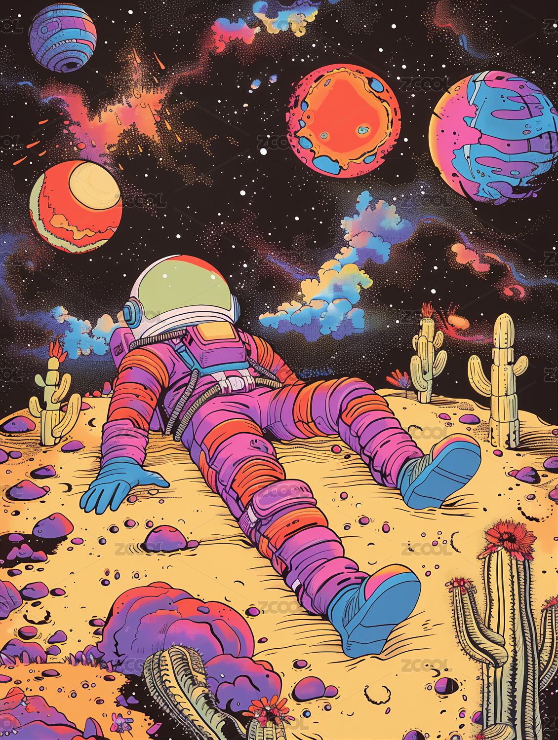 外星人坐在异星地貌上背景是星空和宇宙飞船