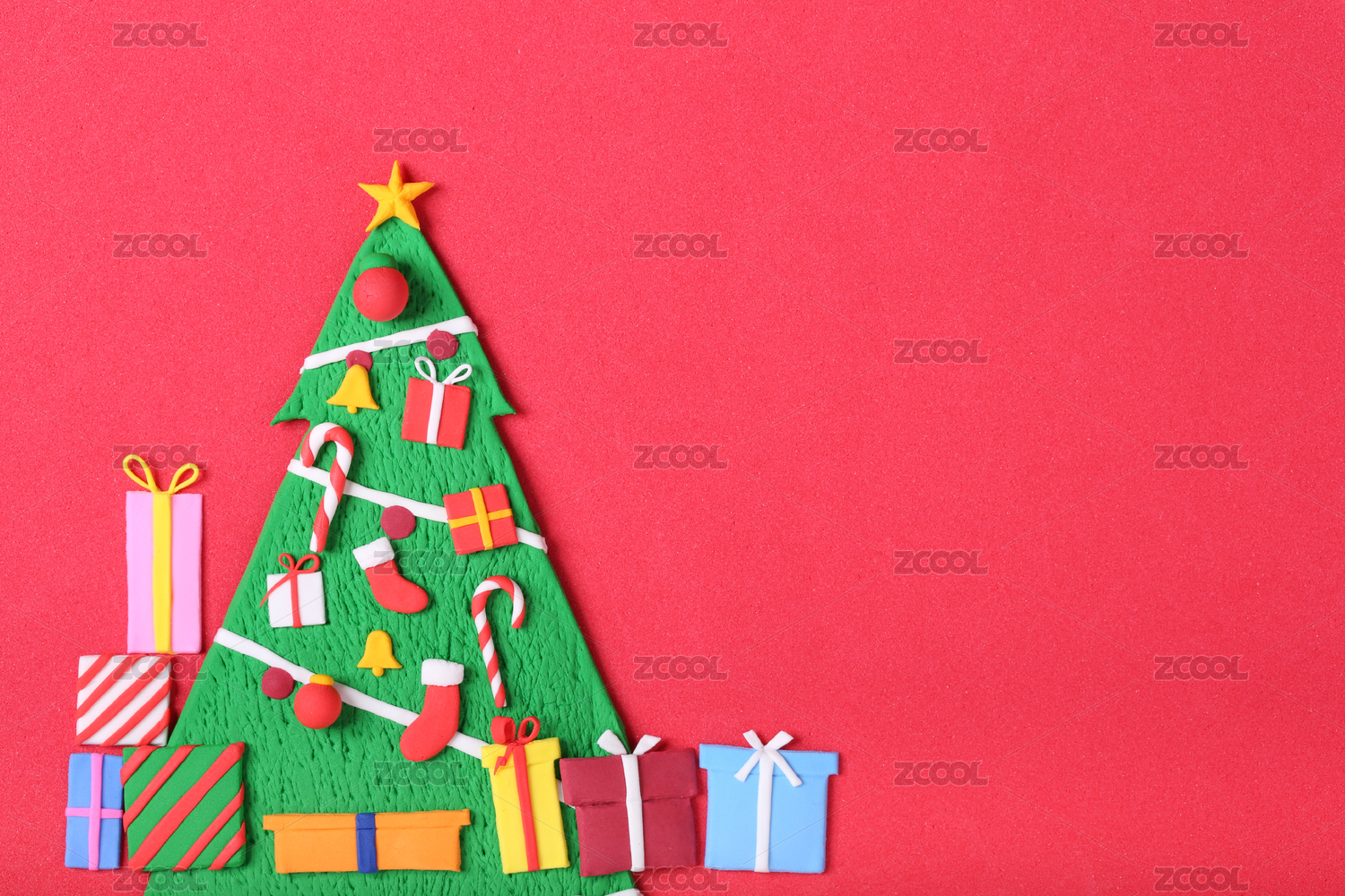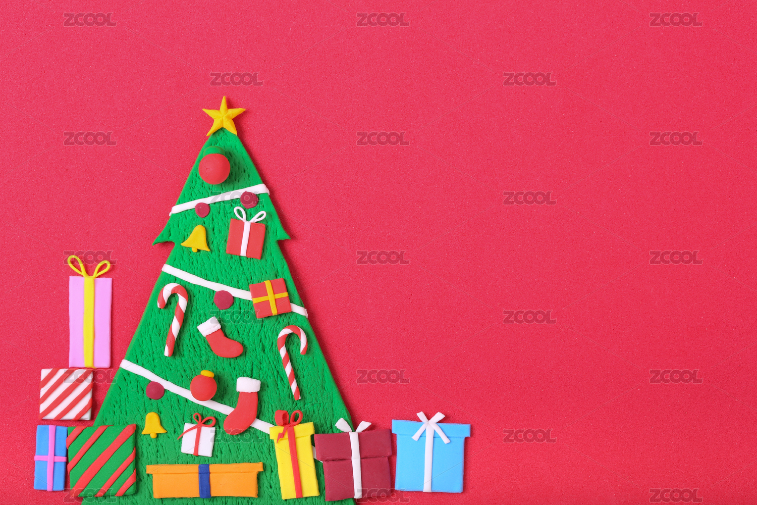 红色海绵纸上摆放彩色粘土捏制的圣诞树和装饰挂件