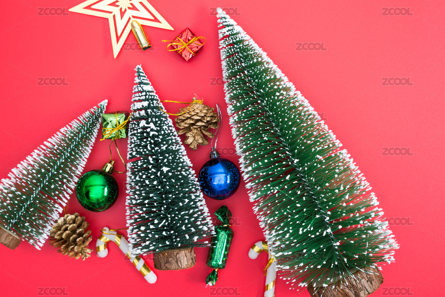 圣诞节背景,圣诞树,圣诞球,星星等圣诞节装饰品在红色背景上