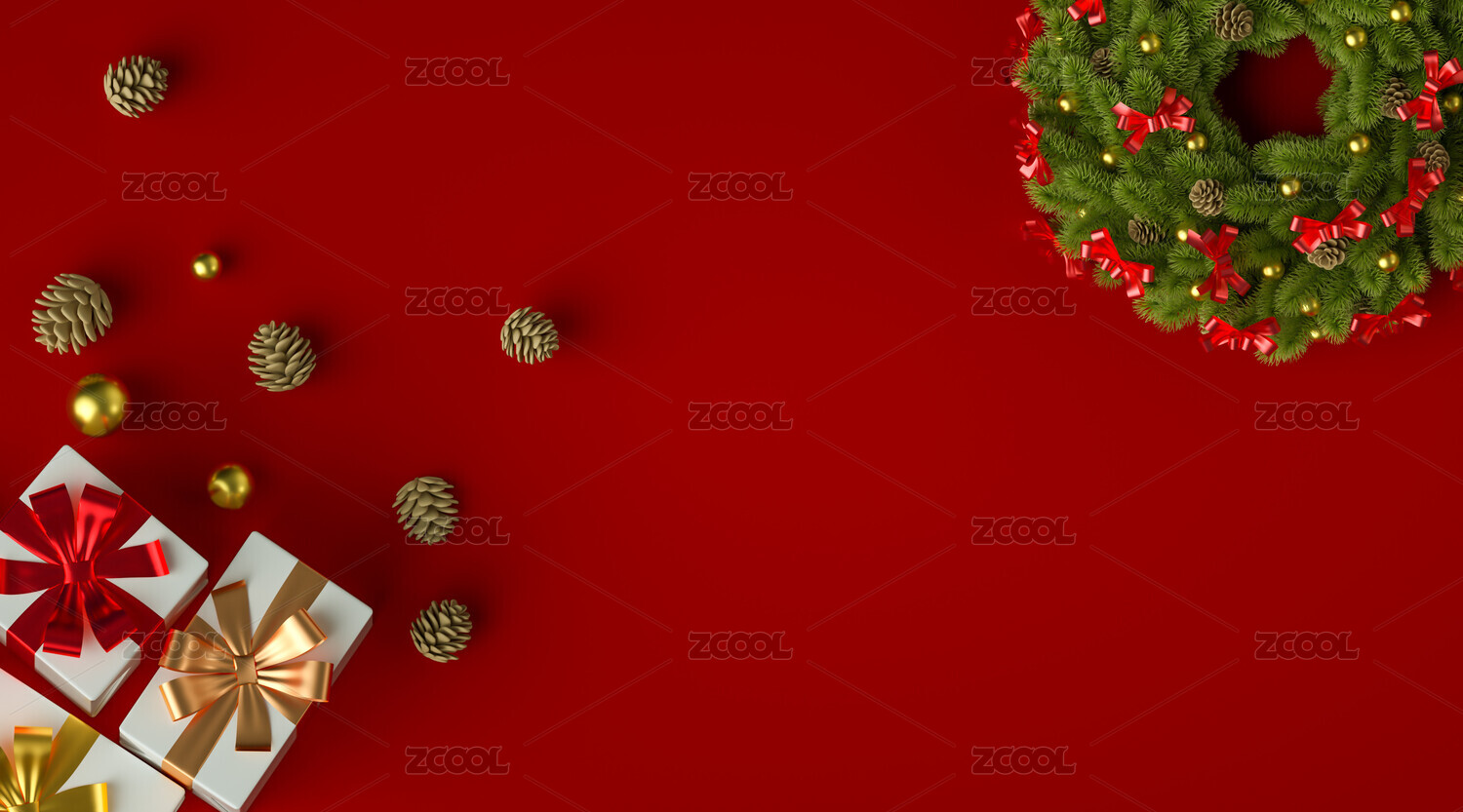 圣诞花环礼物松子散落写实三维红色背景