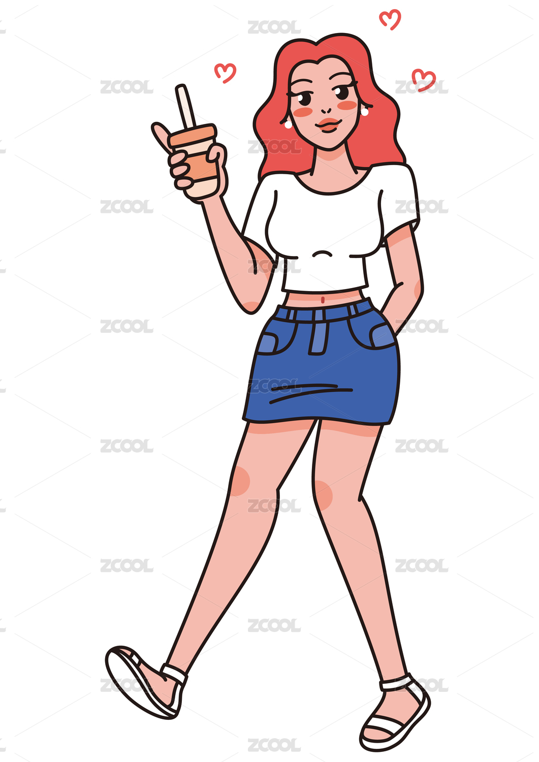 拿咖啡背斜挎包长卷发的时尚女孩插画