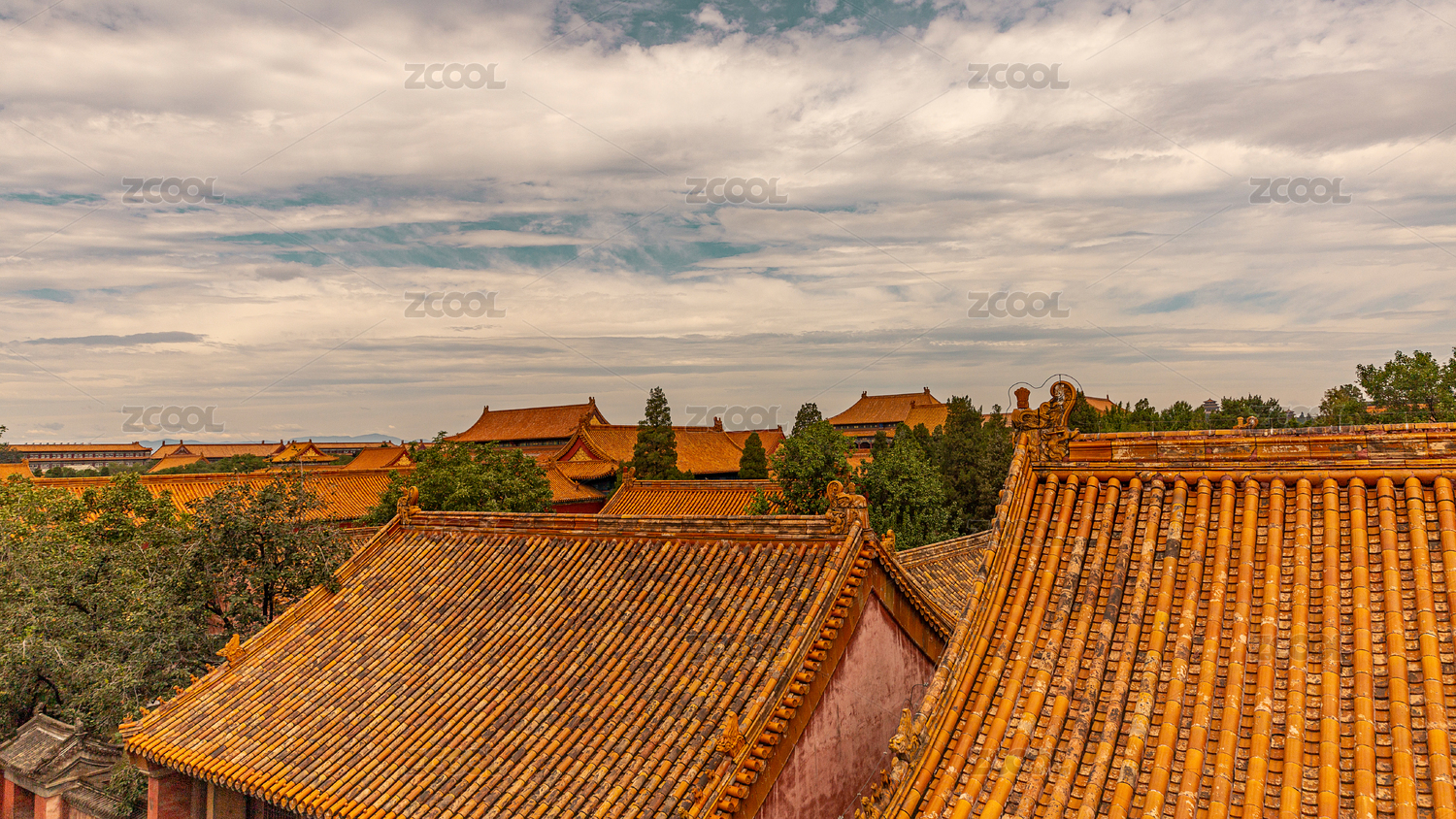 晴朗的蓝天下中国北京故宫博物院宫殿屋檐特写