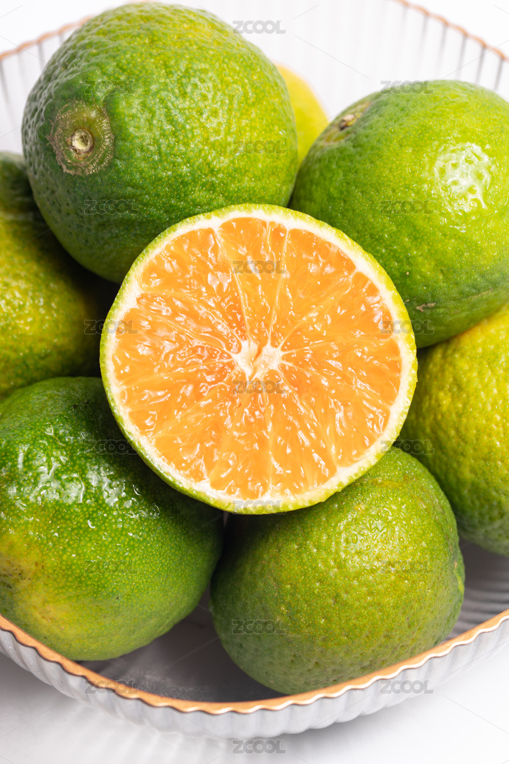 白底盘子里放着两个完整的皇帝柑和贡柑果肉