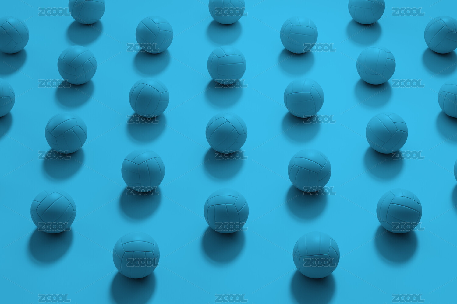 3d渲染蓝色排球排列在蓝色背景上。运动装备。竞技比赛。团队协作的创意设计概念背景