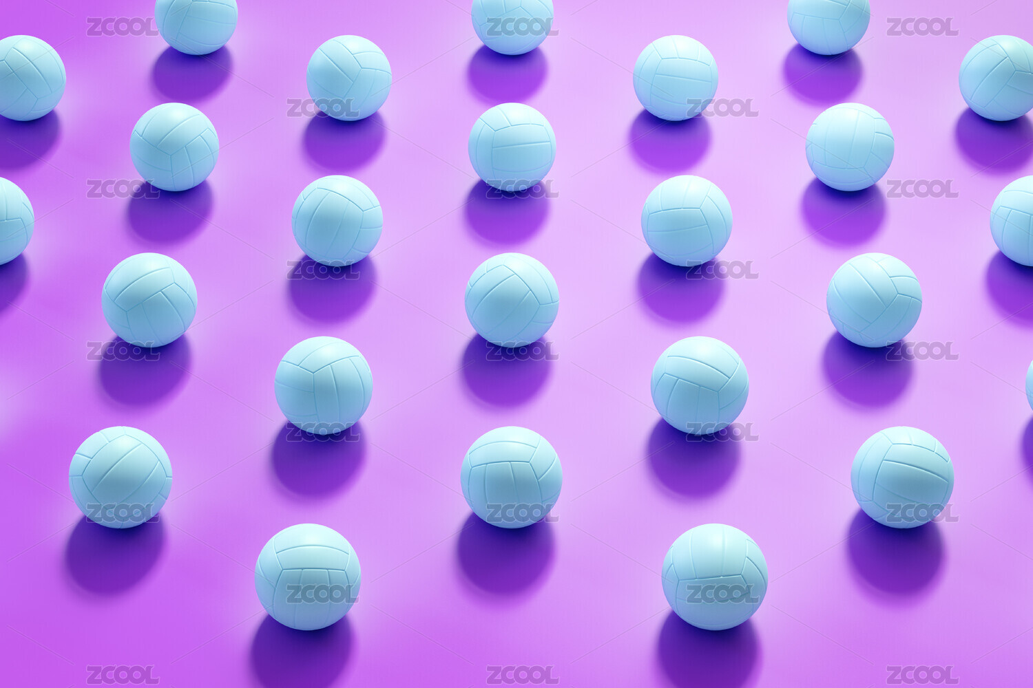 3d渲染淡蓝色排球排列在紫色背景上。运动装备。竞技比赛。团队协作的创意设计概念背景