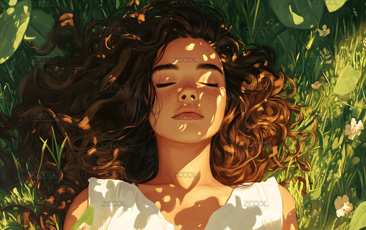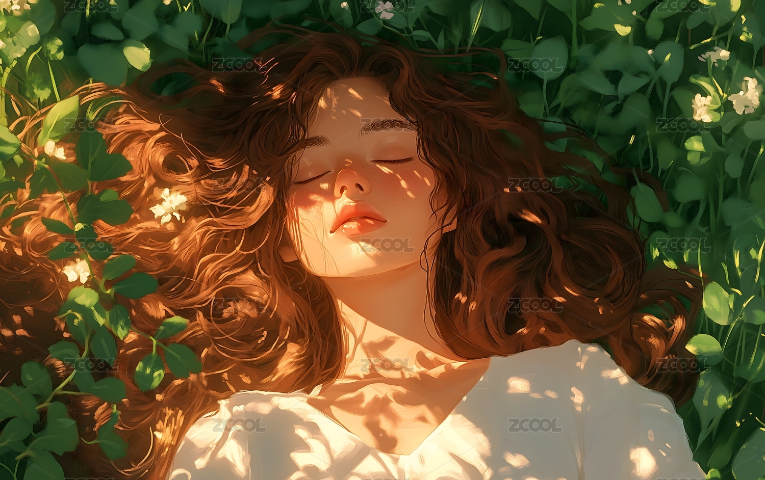 躺在草地上睡觉的女孩唯美风格壁纸背景