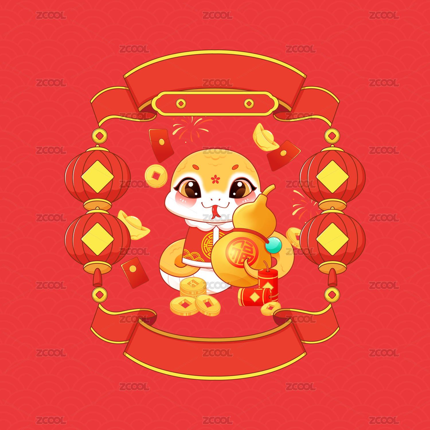 蛇年春节新年可爱卡通形象国潮矢量插画海报