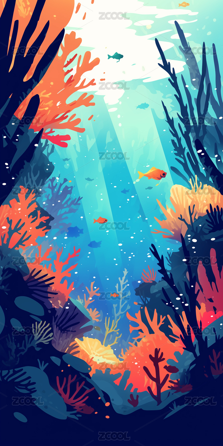 清新,明亮,海底,彩色,珊瑚,插画,绘画,海里,水下,珊瑚礁