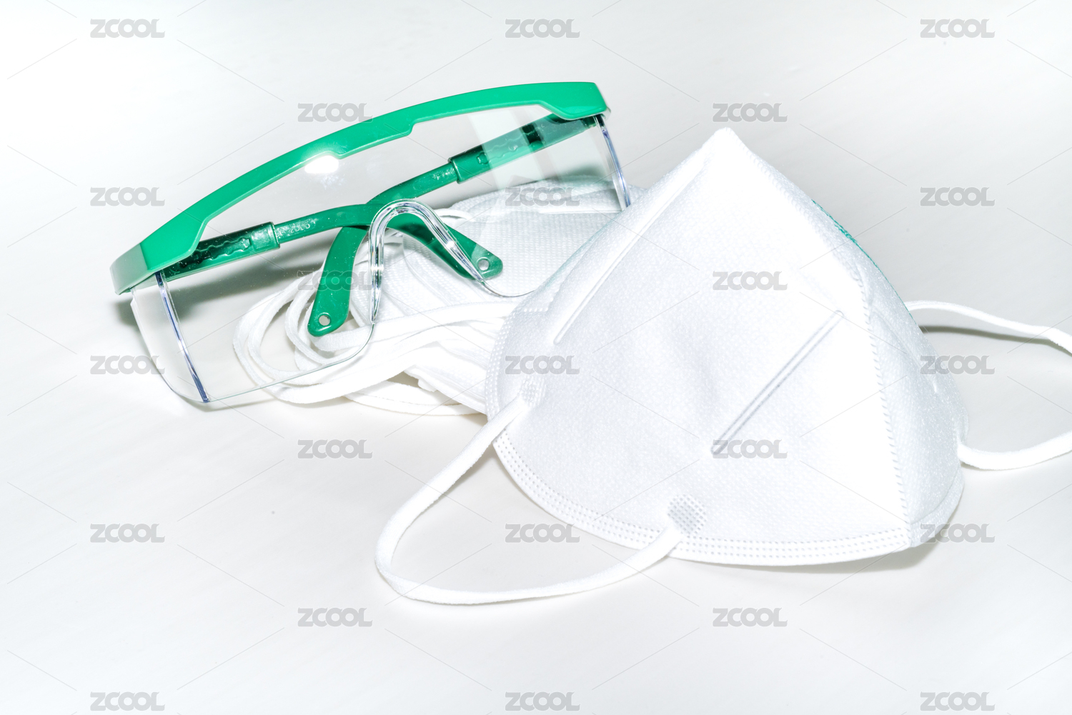 护目镜旁边蓝色一次性医用口罩和水银温度计