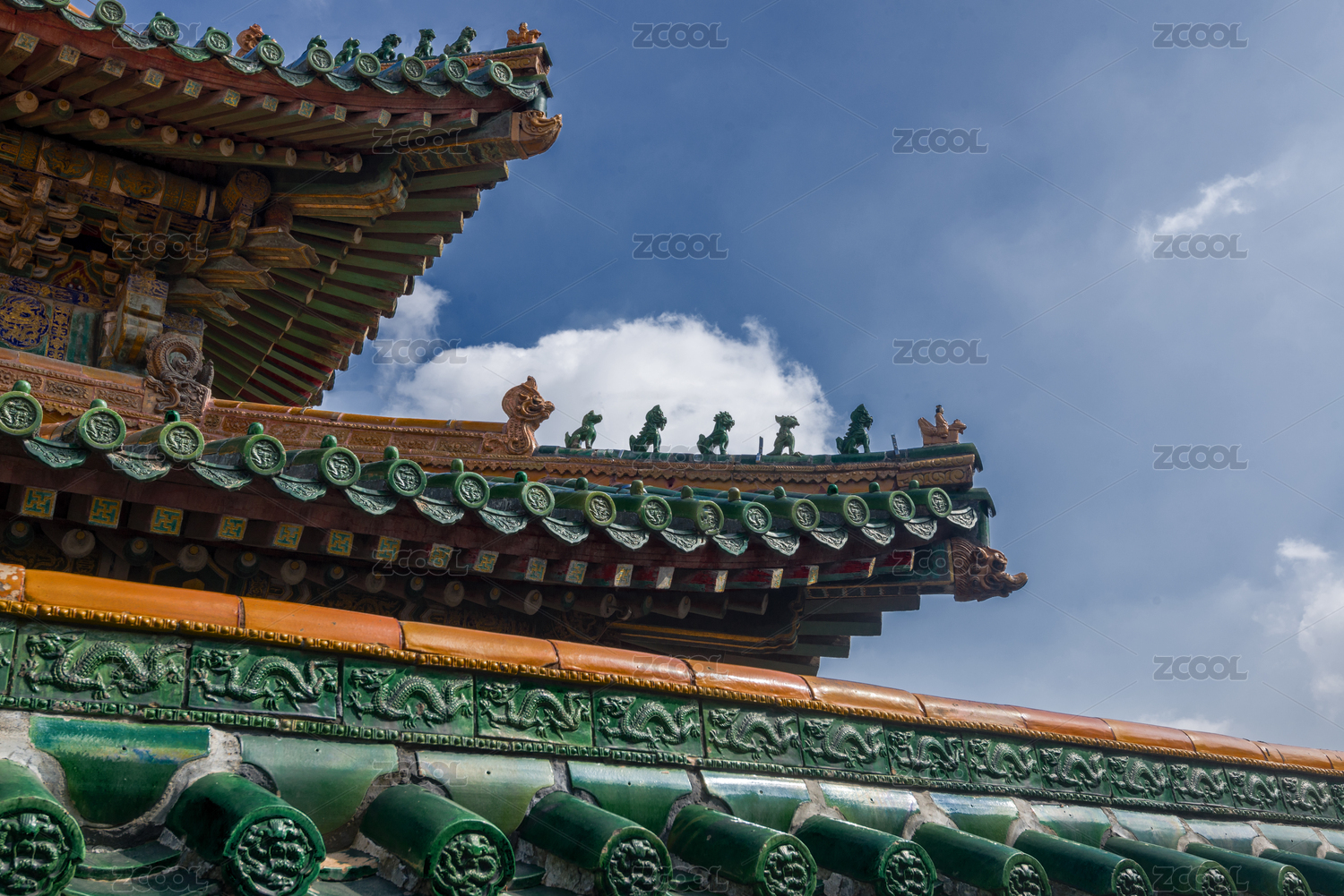 中国北京景山公园古建侧面一角—琉璃瓦屋顶飞檐彩绘描金万字纹龙纹