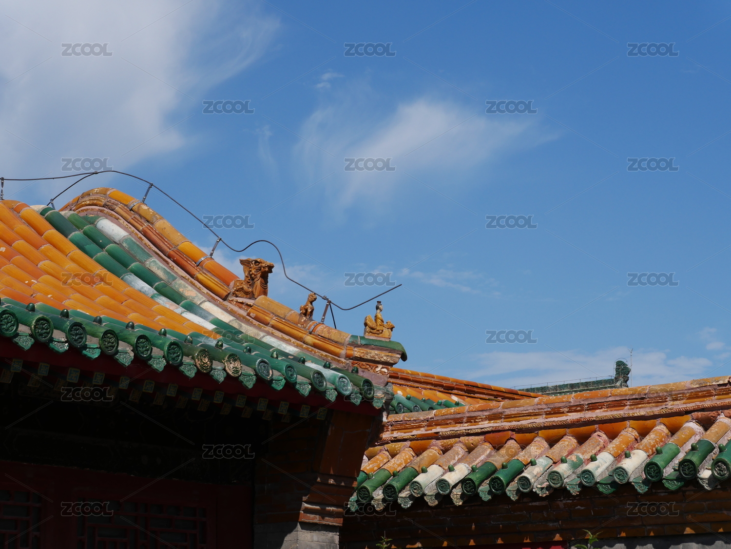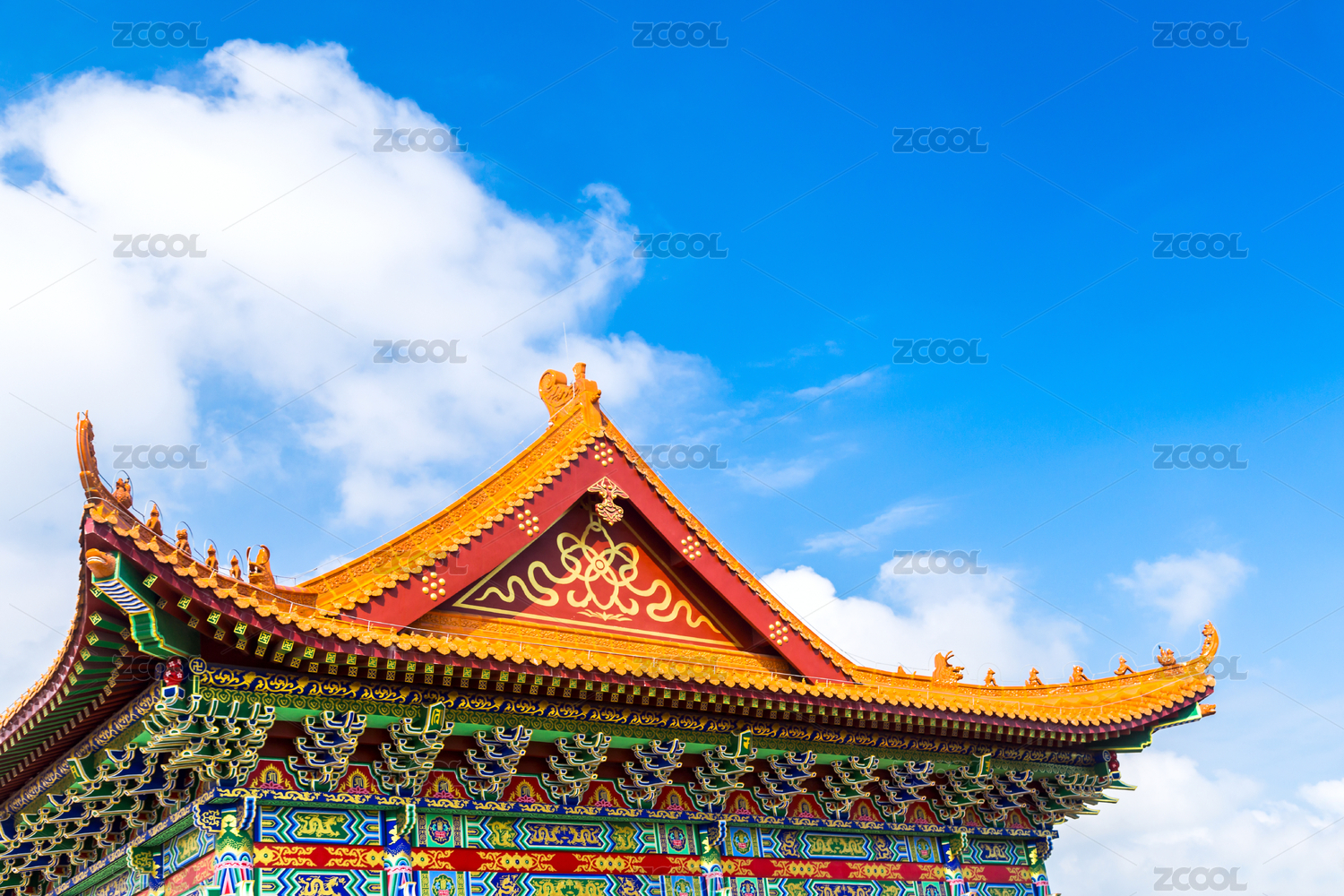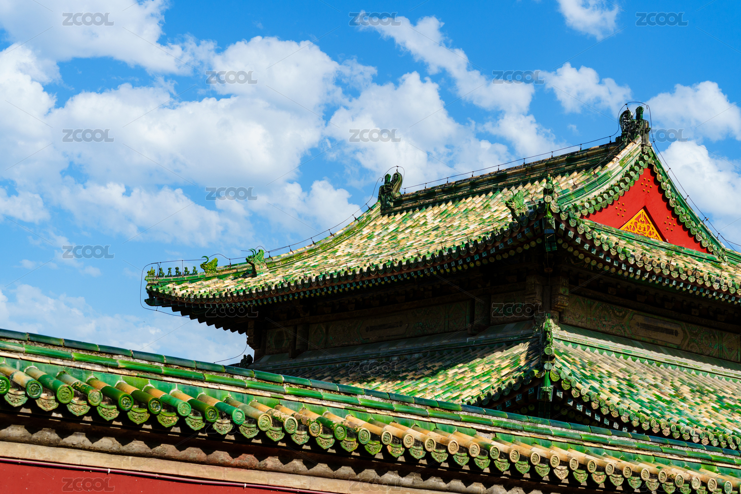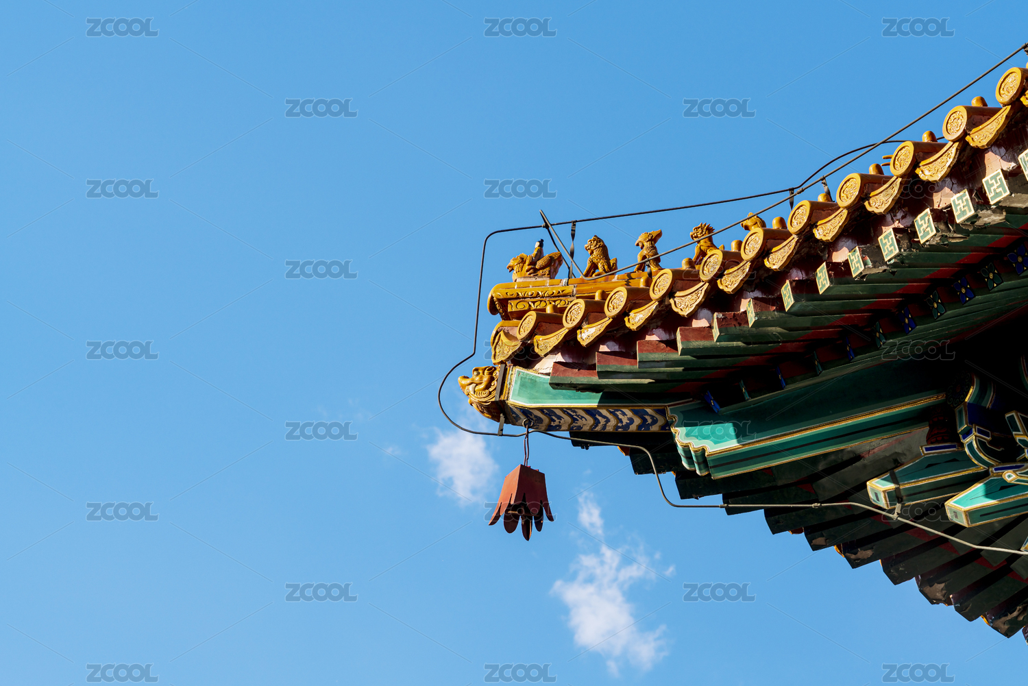 蓝天下的北京中山公园宰牲亭屋顶房檐特写