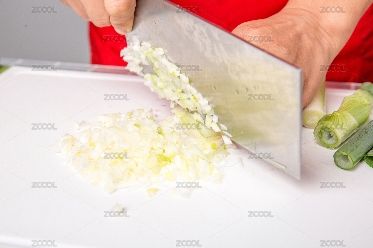 厨师把菜刀上的大蒜末放入青花瓷碗