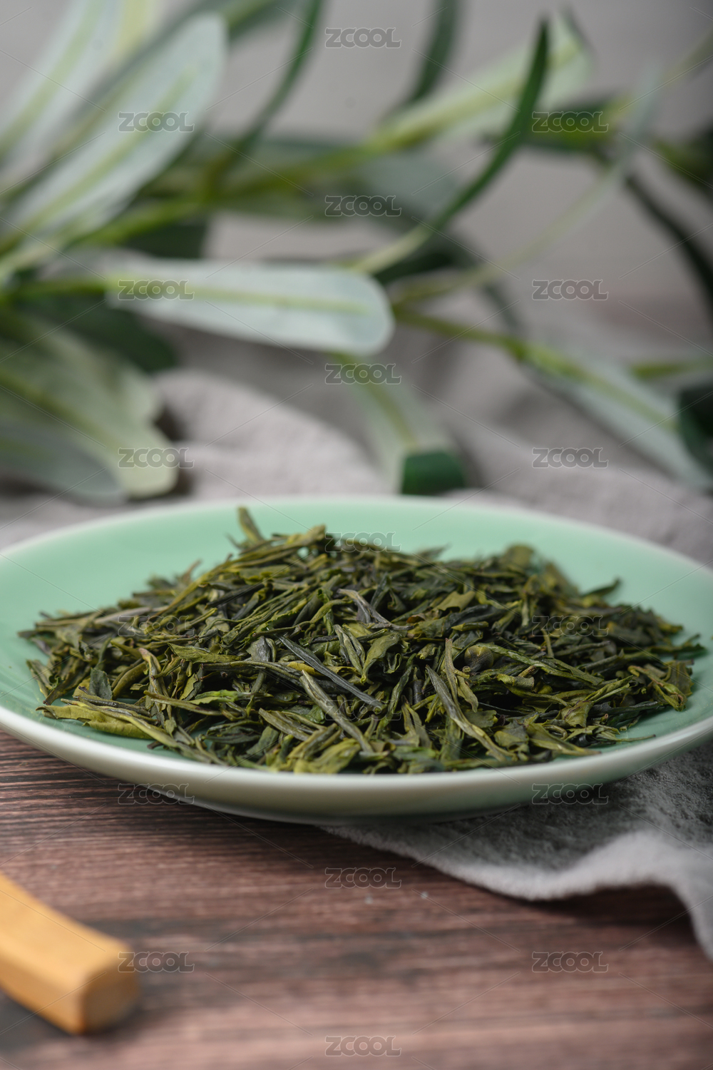桌面上的盘子里的香气四溢的雀舌茶