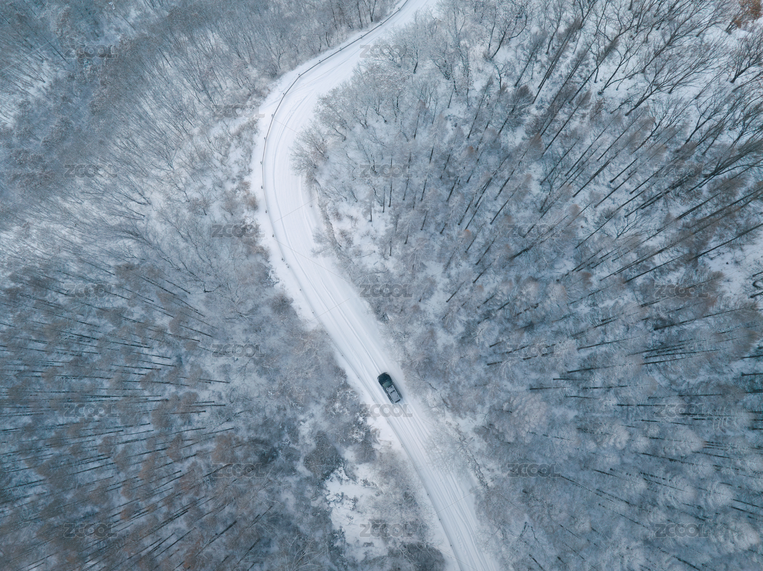 正上方航拍汽车行驶在暴雪后的林中公路