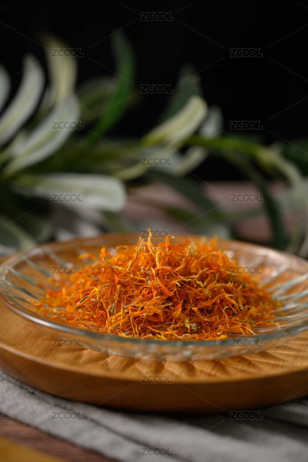 桌面上的盘子里的干爽的金盏菊花花瓣