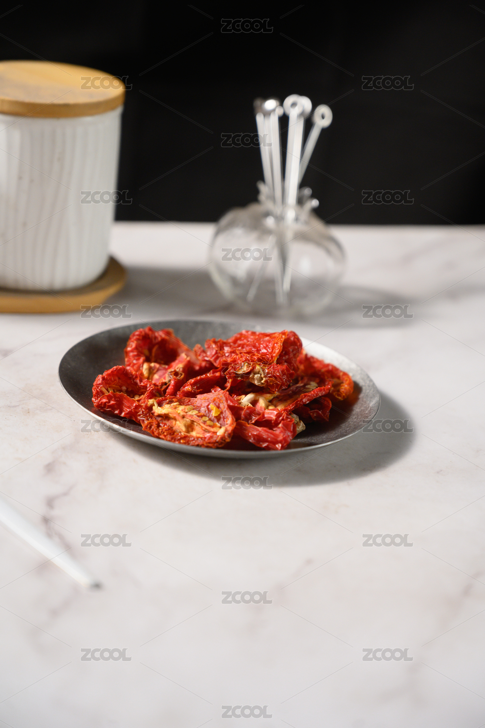 桌面上的盘子里的美味可口的西红柿干