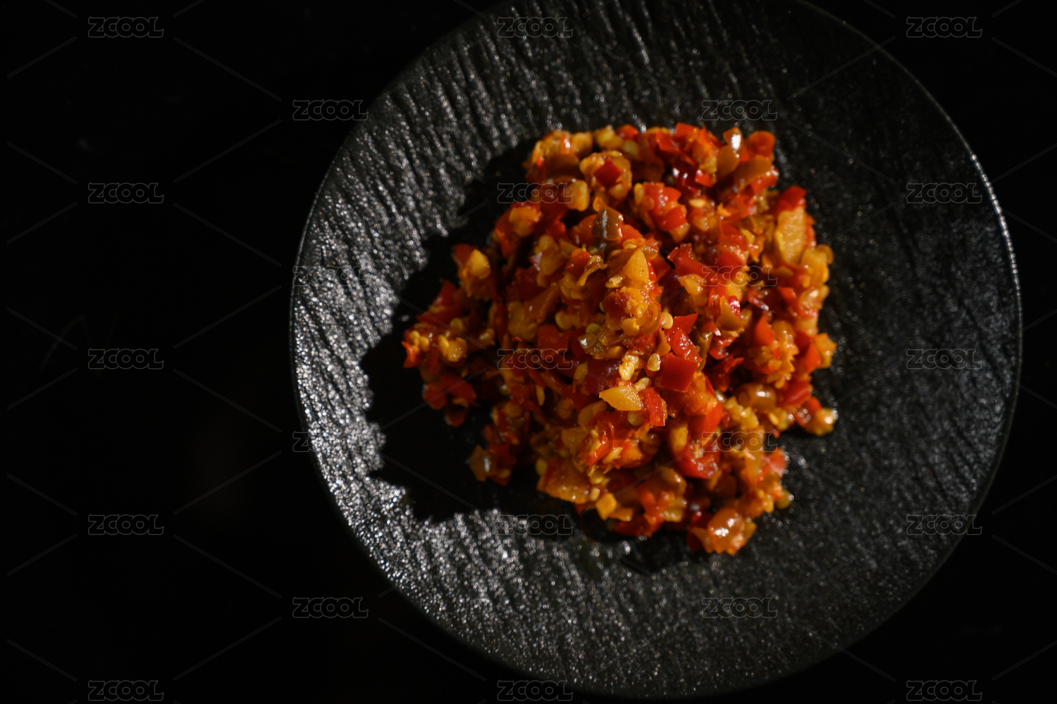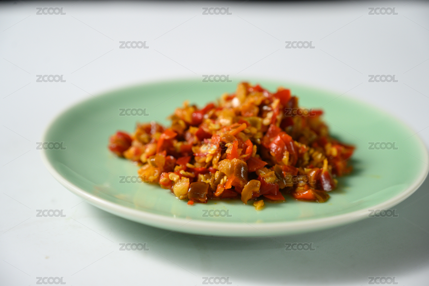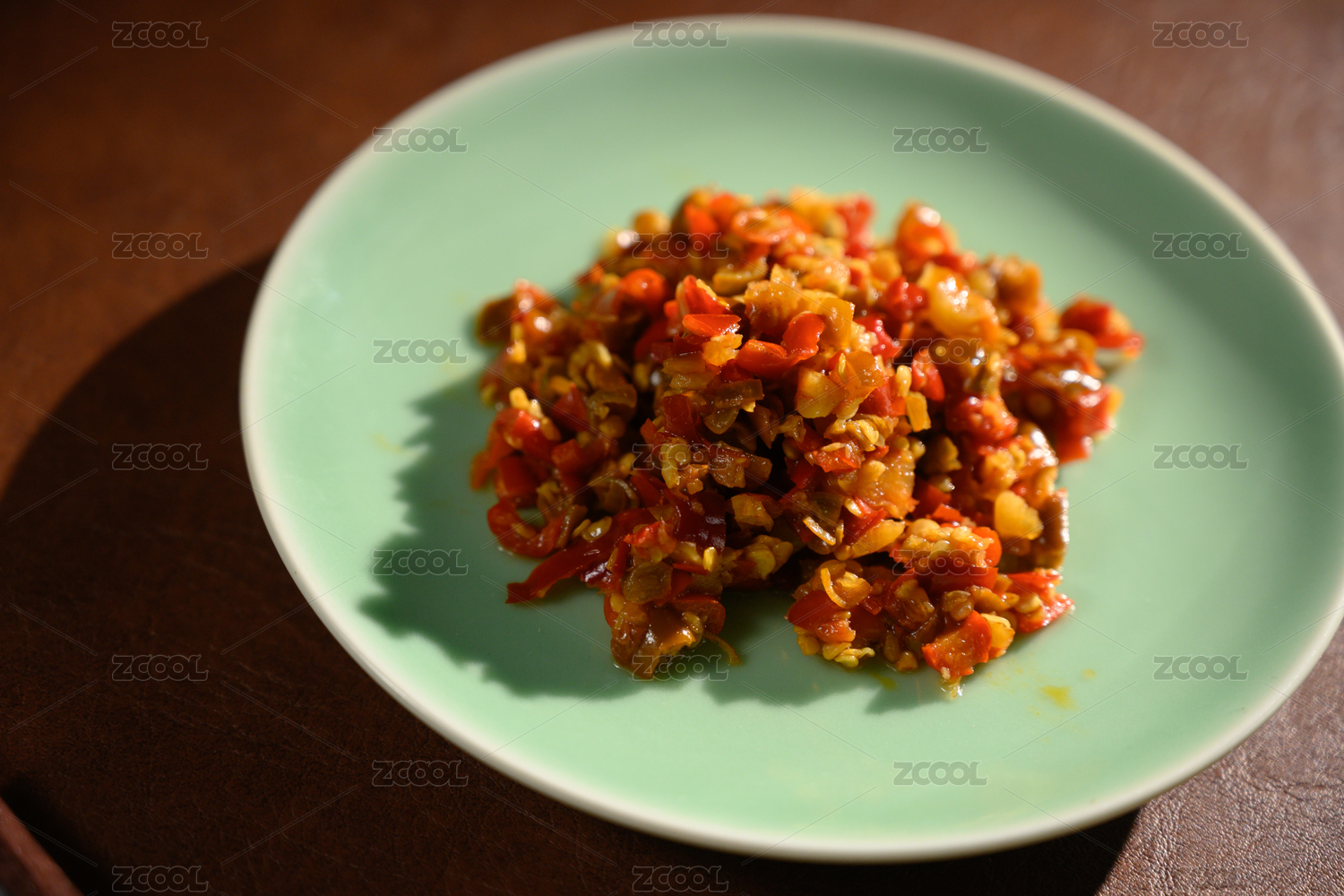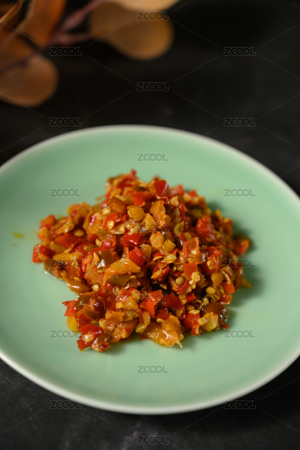 桌面上的盘子里的美味可口的青红剁椒