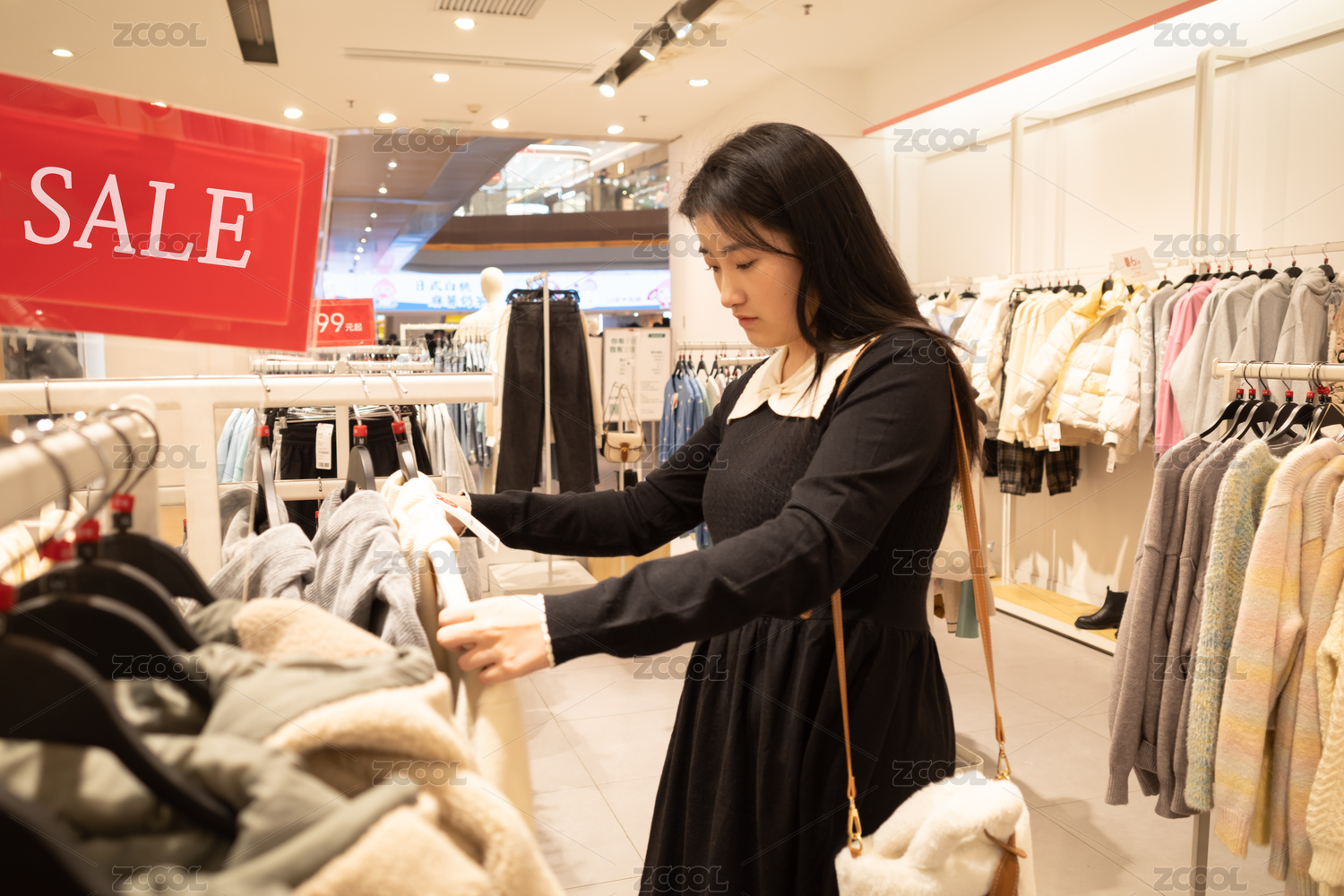 年轻漂亮的年轻女性在商场寻找挑选试穿服装