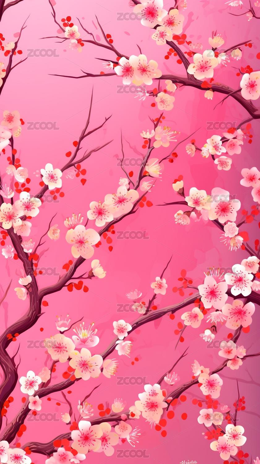 春天竖版插图设计粉色桃花开满枝头