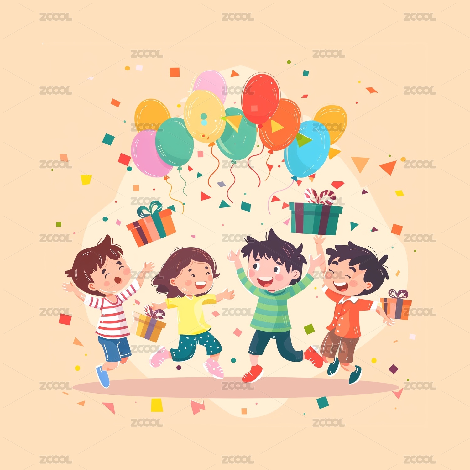 童节快乐跳跃的孩子和气球彩带庆祝
