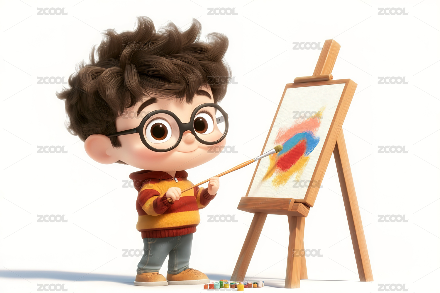 3d风格一个小男孩正在画画场景插画