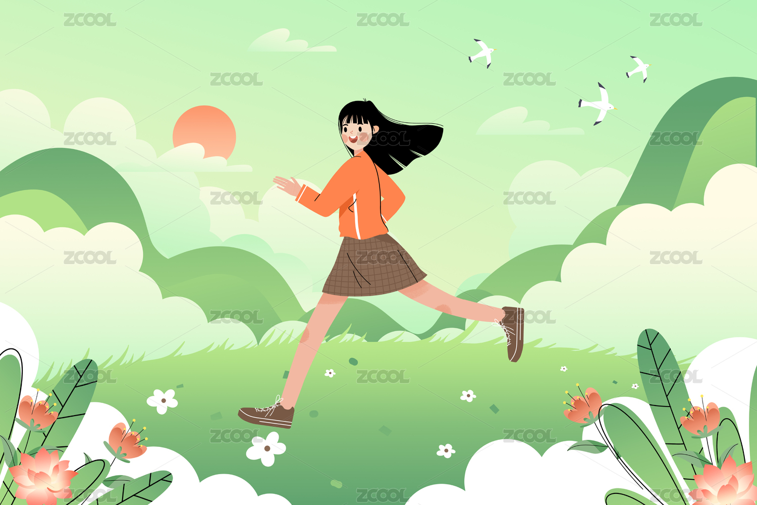 卡通手绘女孩夕阳下奔跑唯美banner通用背景插画