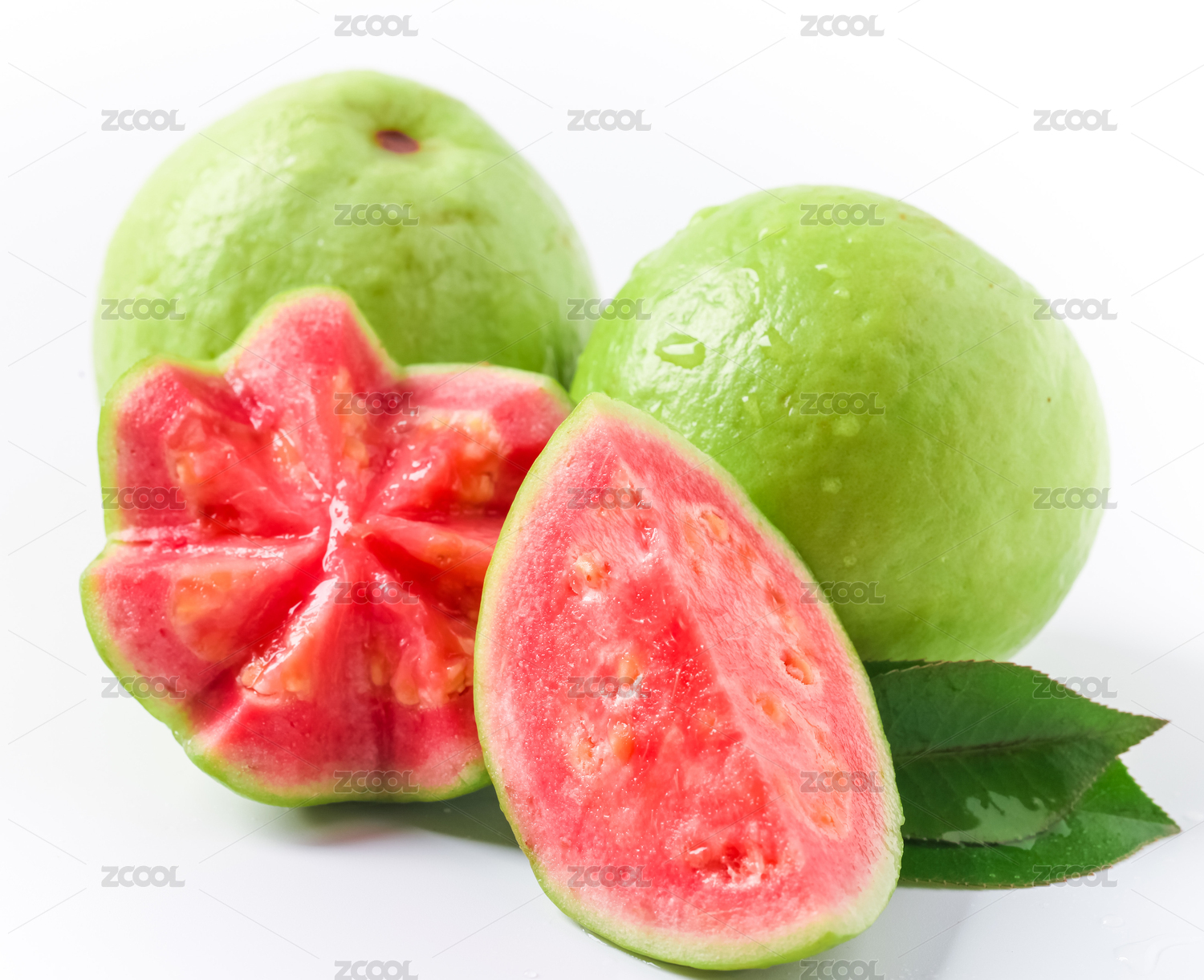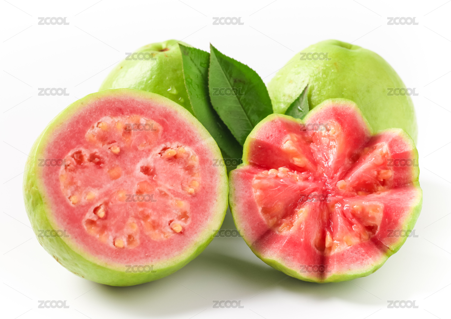 白底上有三个完整的芭乐,前有一个有切面的红心芭乐和两块芭乐果肉