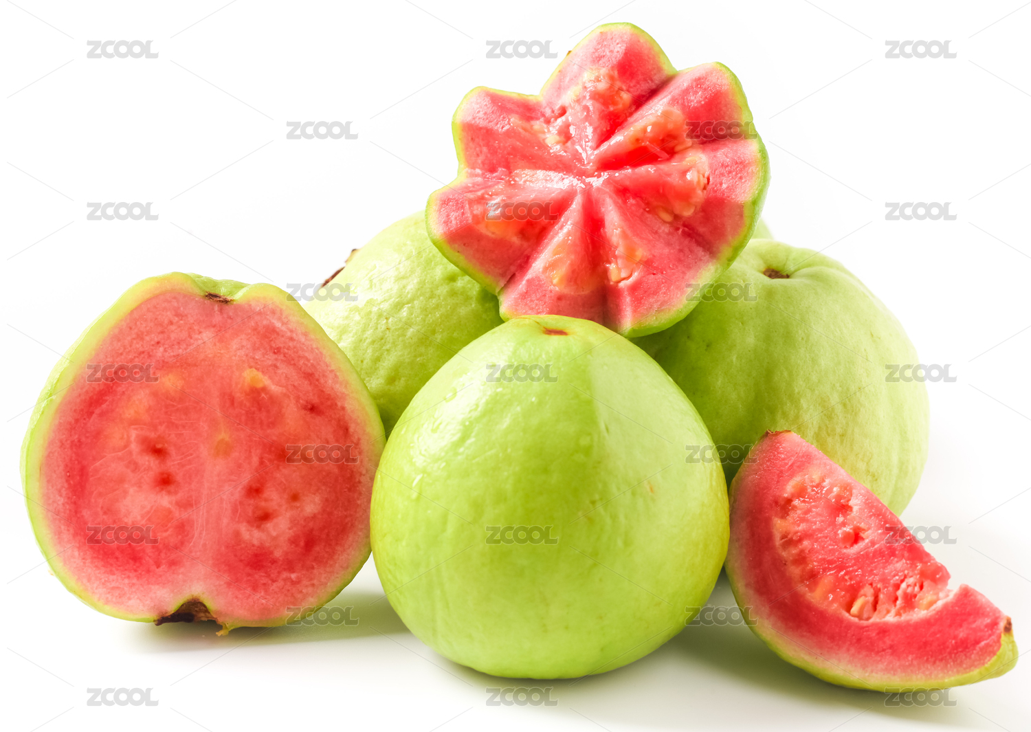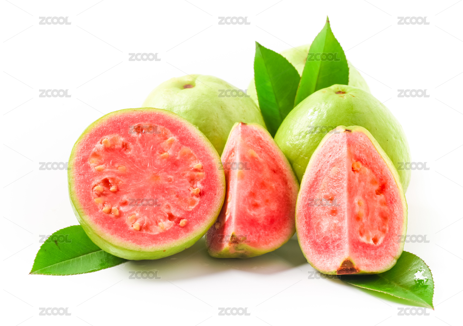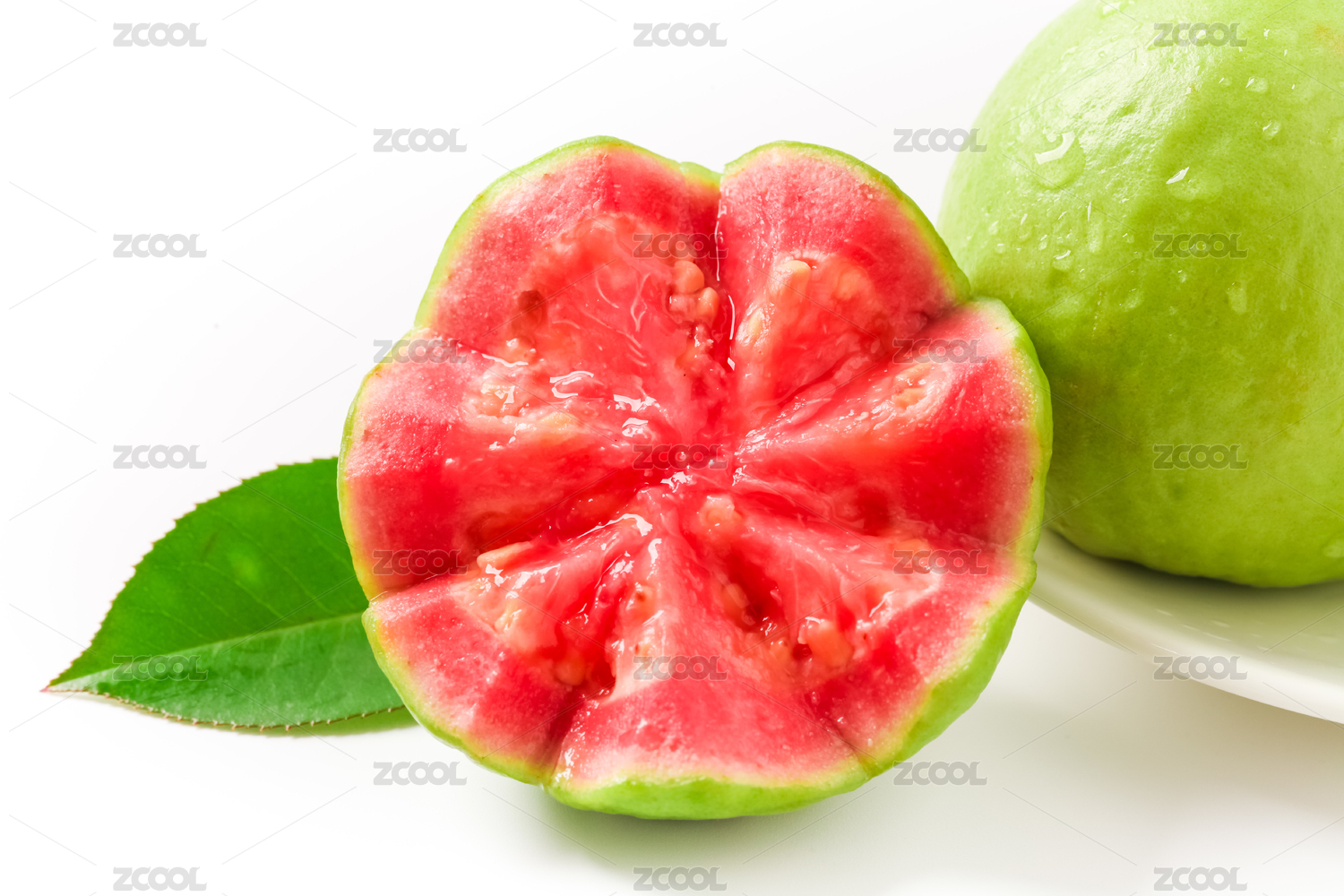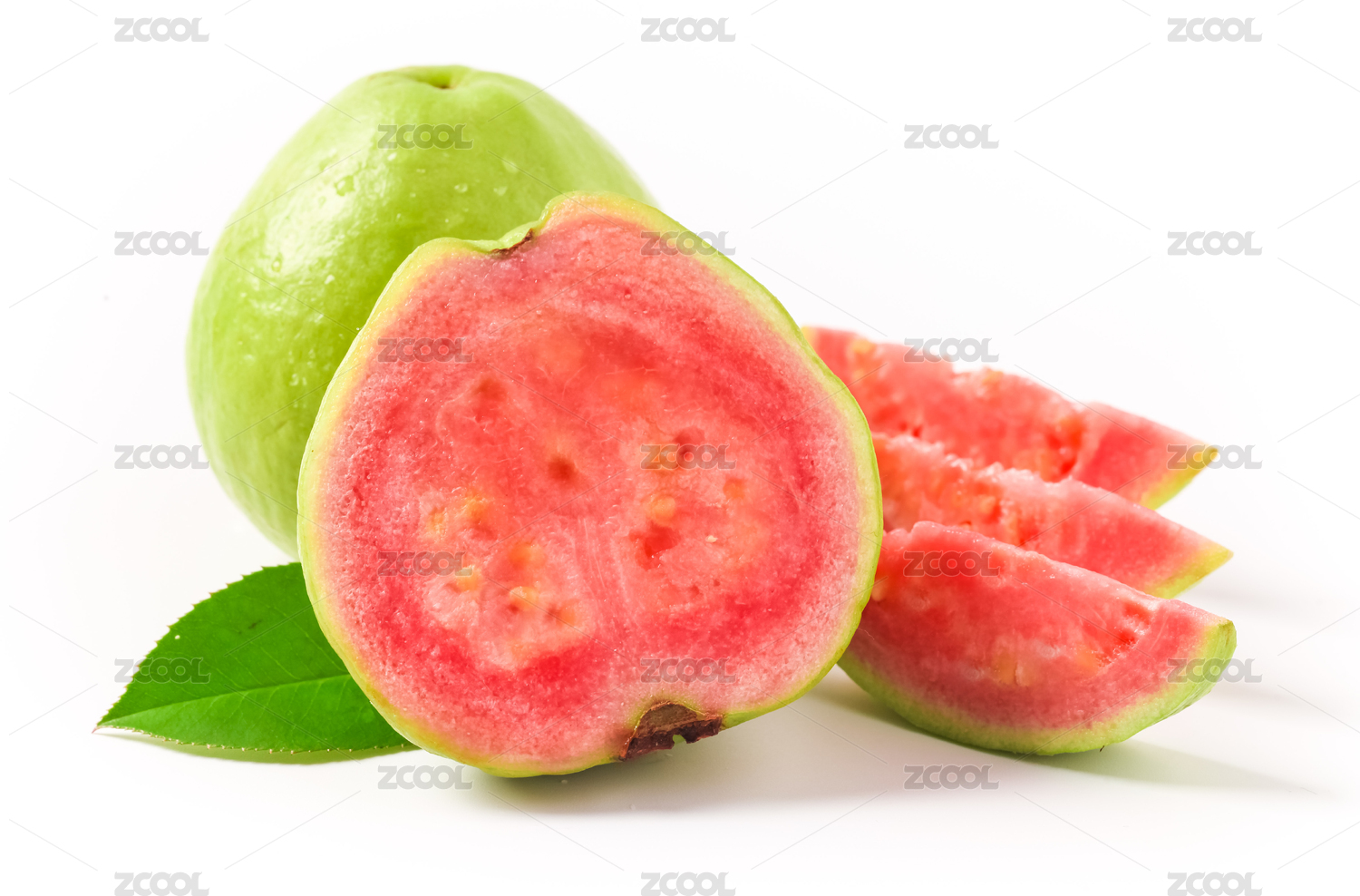 白底上一个有圆形切面的红心芭乐和两个芭乐块,后面有三个完整的芭乐果子