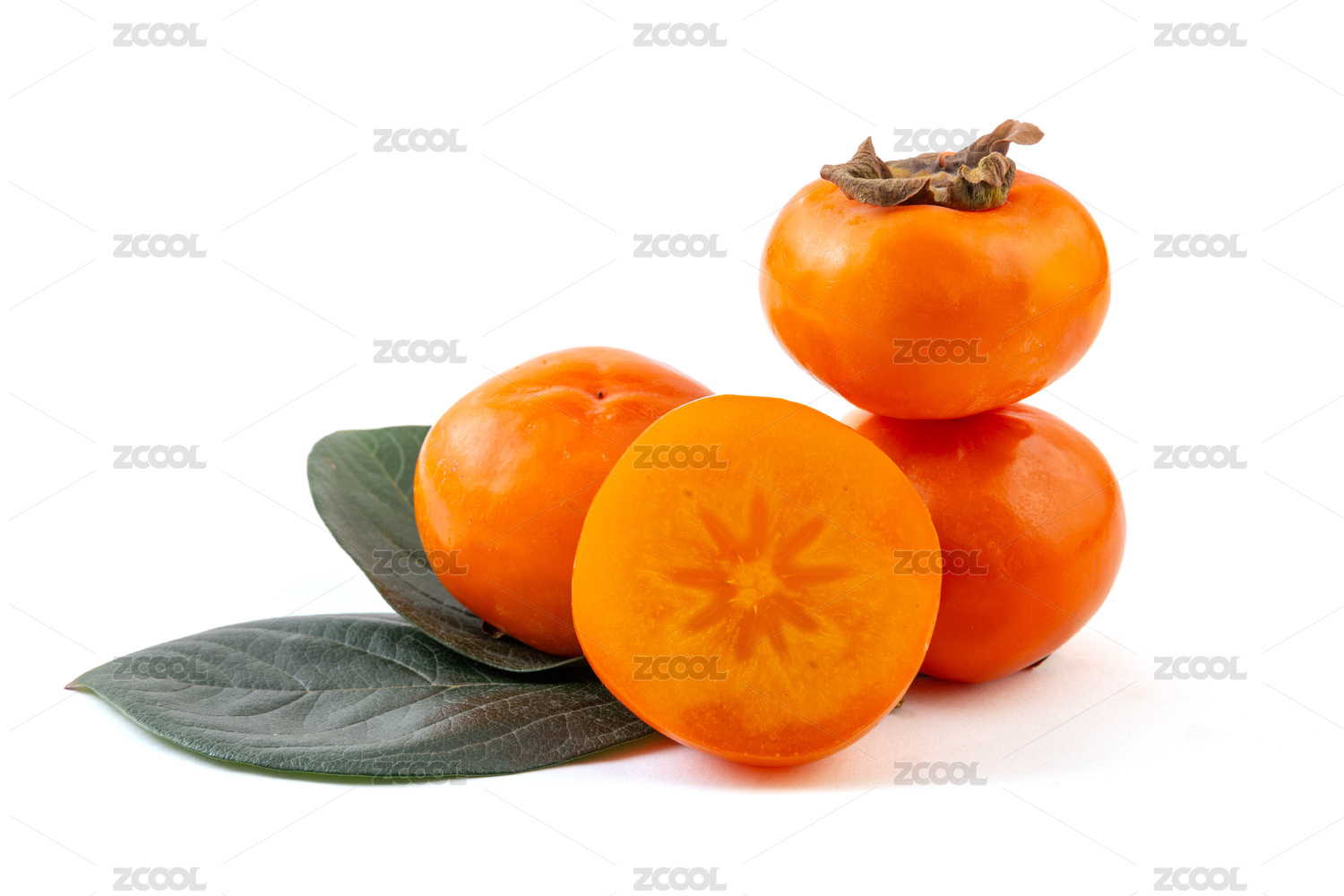 白底上放着柿子和掰开的柿子果肉