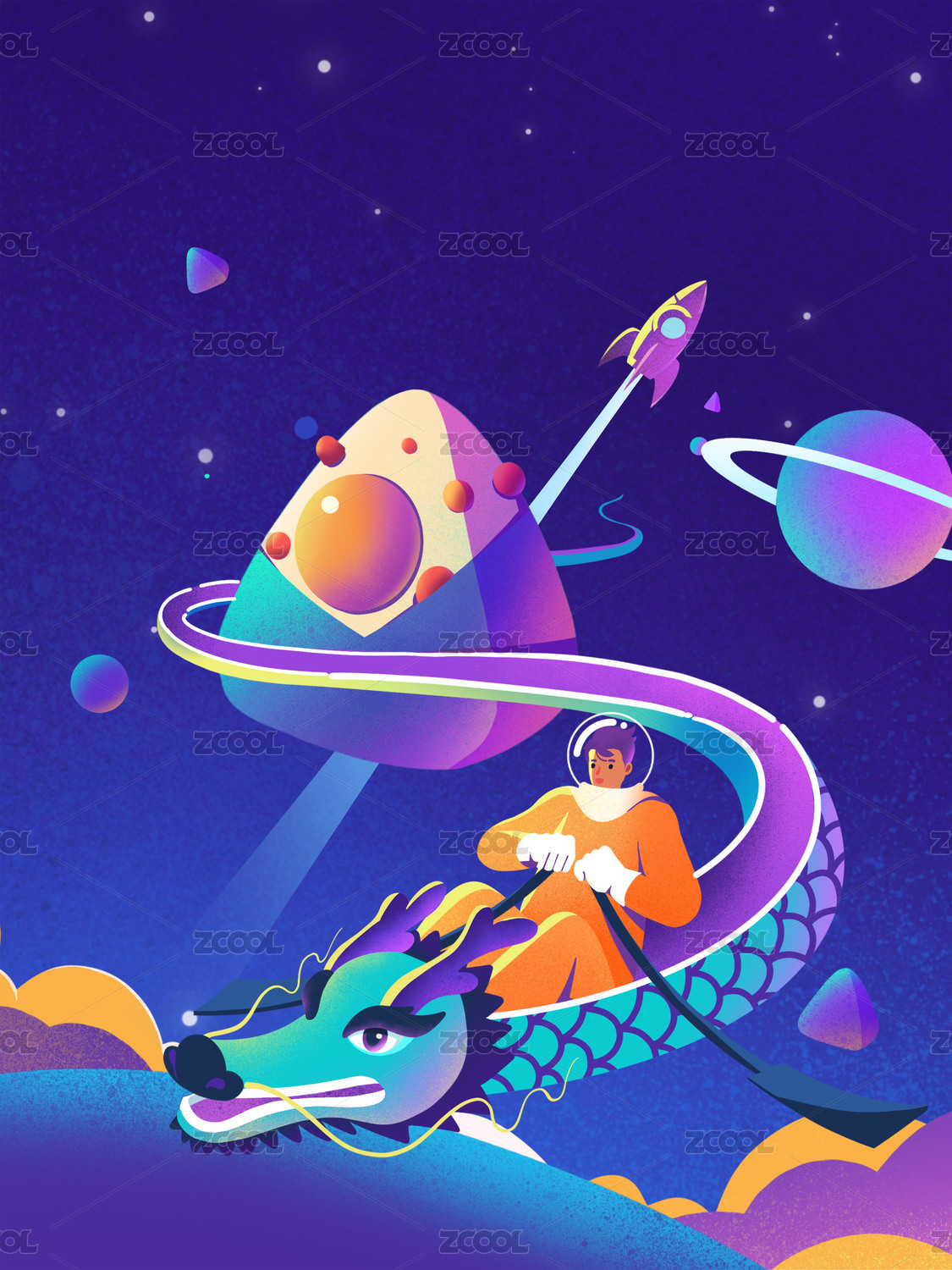 端午节宇航员和粽子科技风创意插画