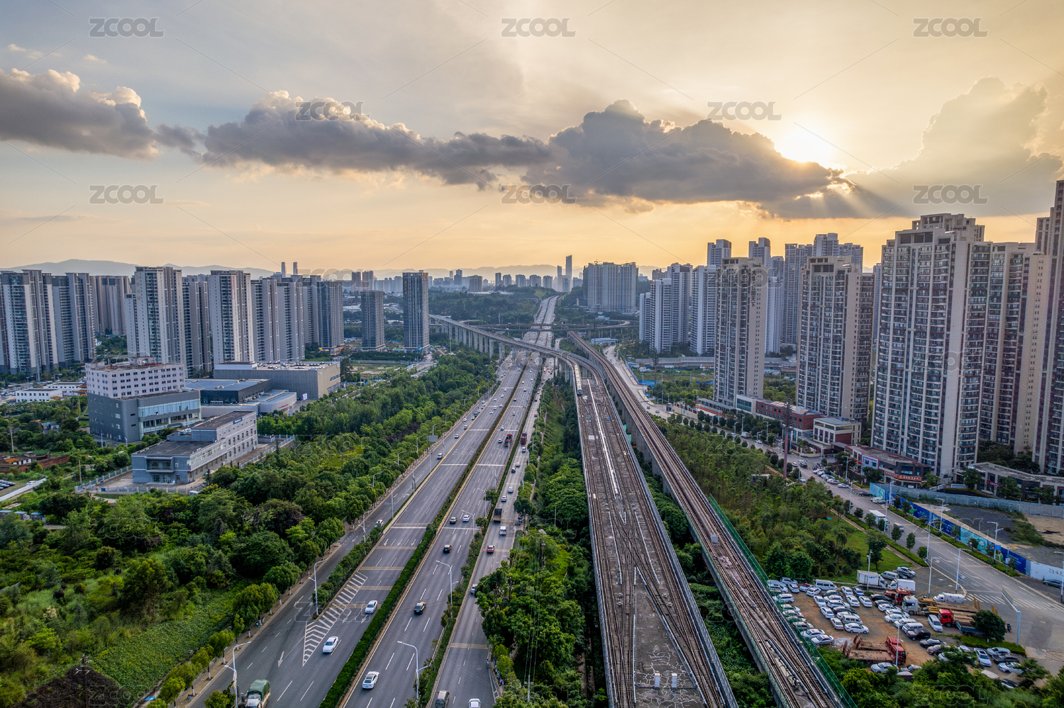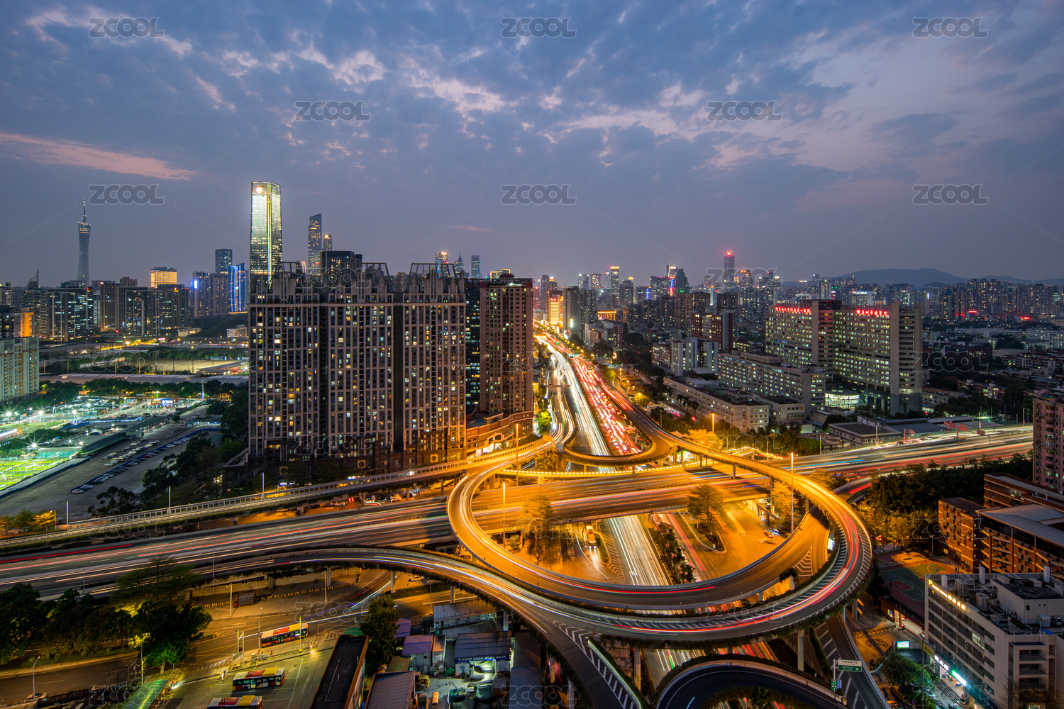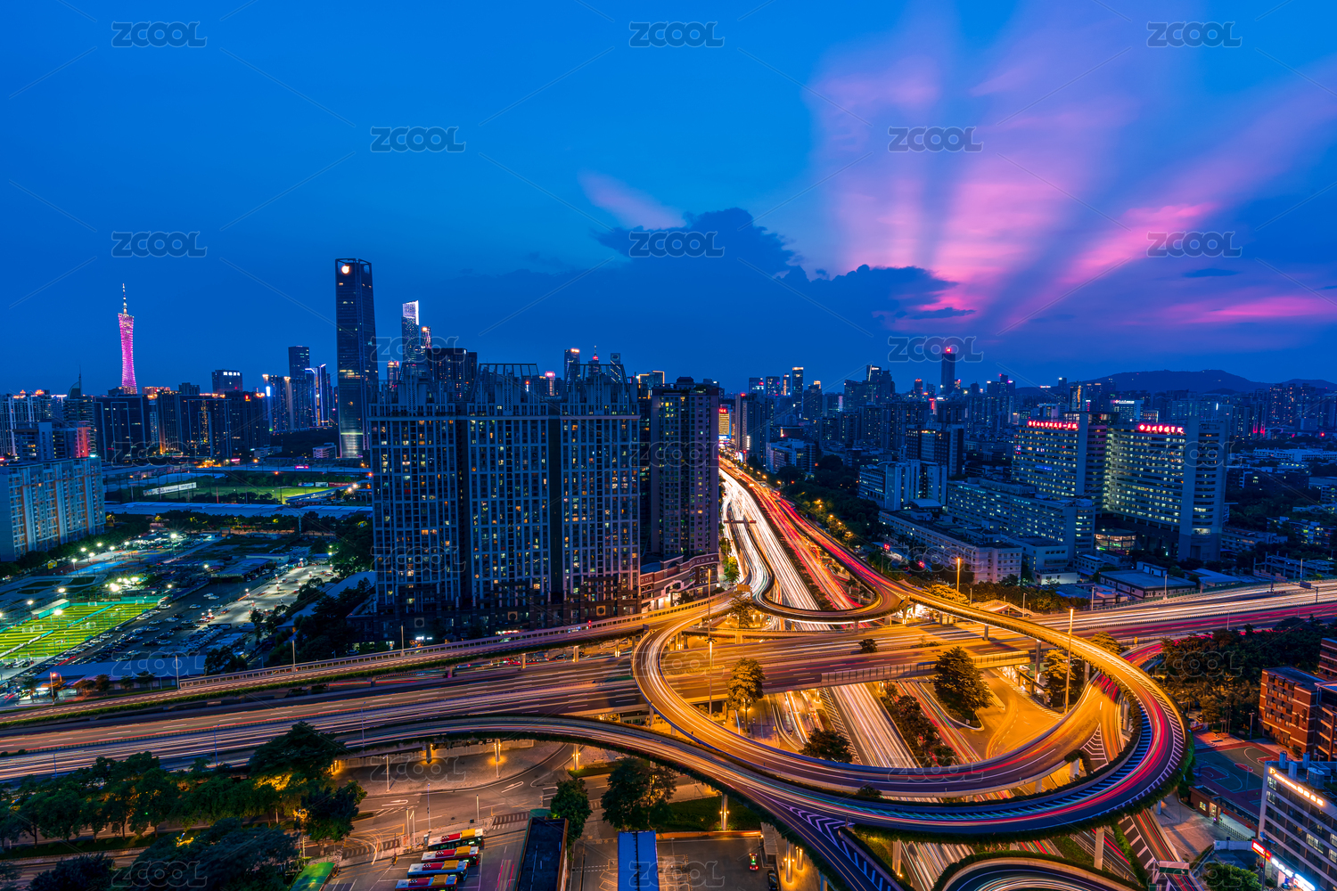 中国广东省珠海环宇城与前山立交晚霞夜景