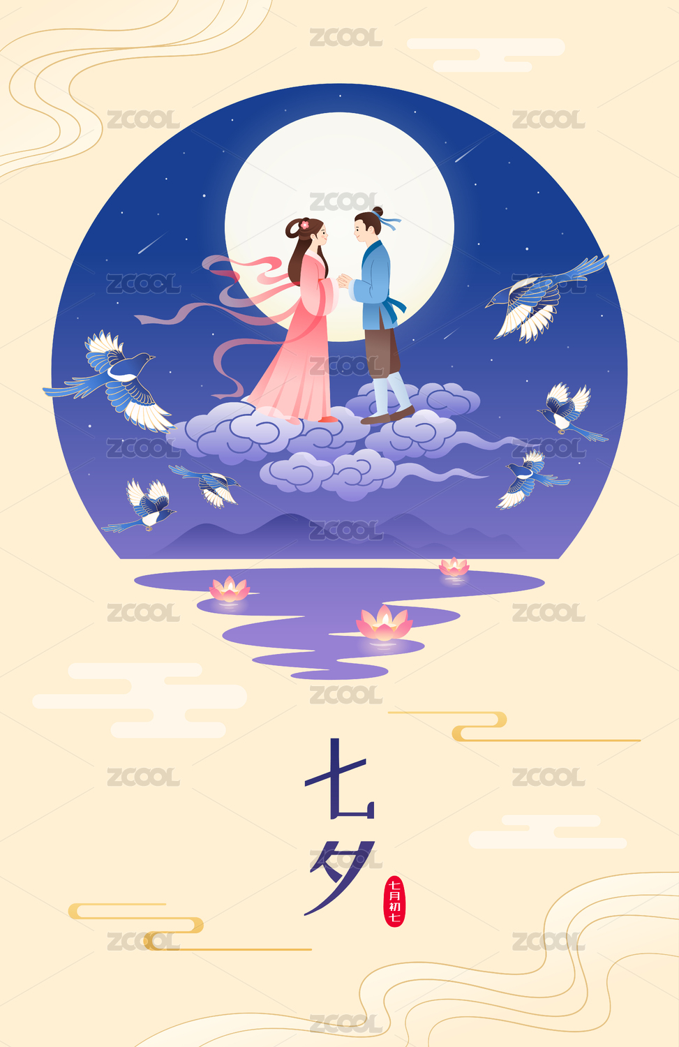 浪漫七夕牛郎织女月下鹊桥相会插画海报