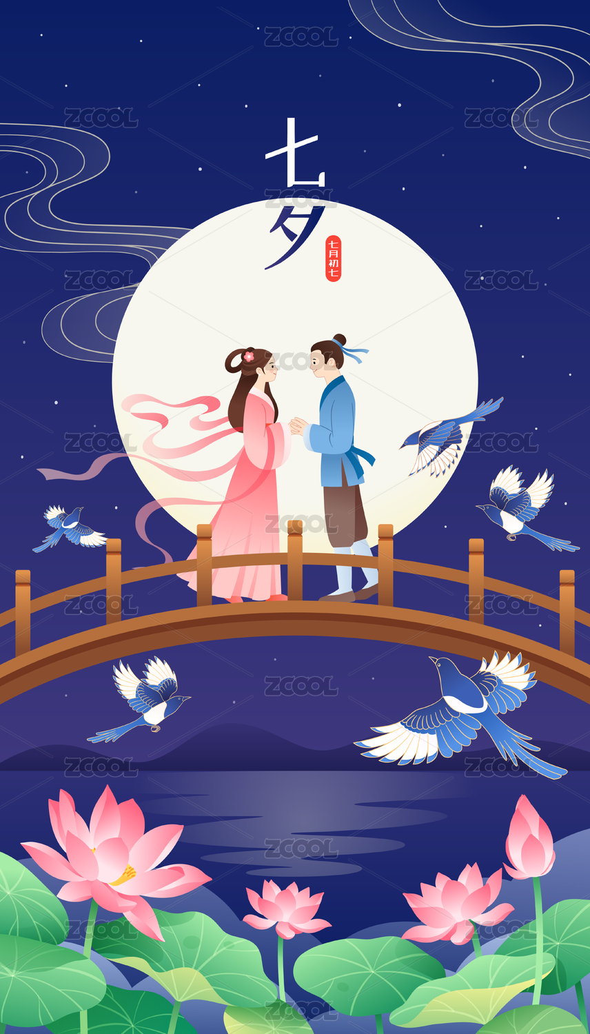 国潮七夕牛郎织女月下鹊桥相会插画海报